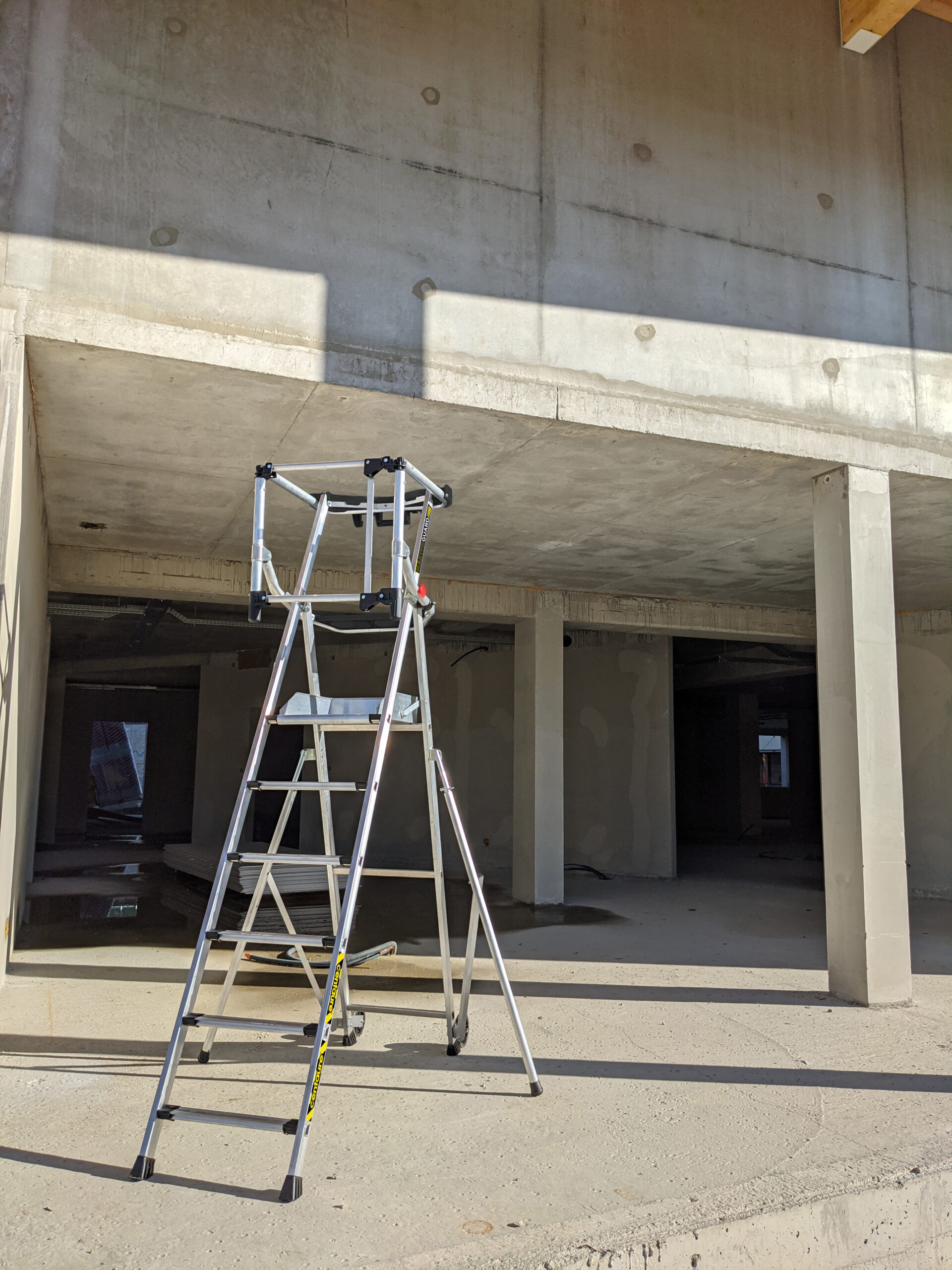 Le système de pantographe breveté à fermeture automatique permet d'accéder facilement et confortablement sur le plancher. Il permet également une protection 360° de l'opérateur. L'accès au plancher antidérapant (0,40 x 0,50 m) se fait par de larges marches antidérapantes de 60 mm. Les roues (diamètre 150 mm) facilitent les déplacements en position ouverte ou fermée sur les chantiers professionnels. Les déplacements sont également facilités grâce à sa poignée de transport. Les stabilisateurs s'adaptent automatiquement à tous types d'environnements et se replient totalement le long des montants pour le transport ou le travail dans les espaces réduits. Les plates-formes sont pliables et compactes.