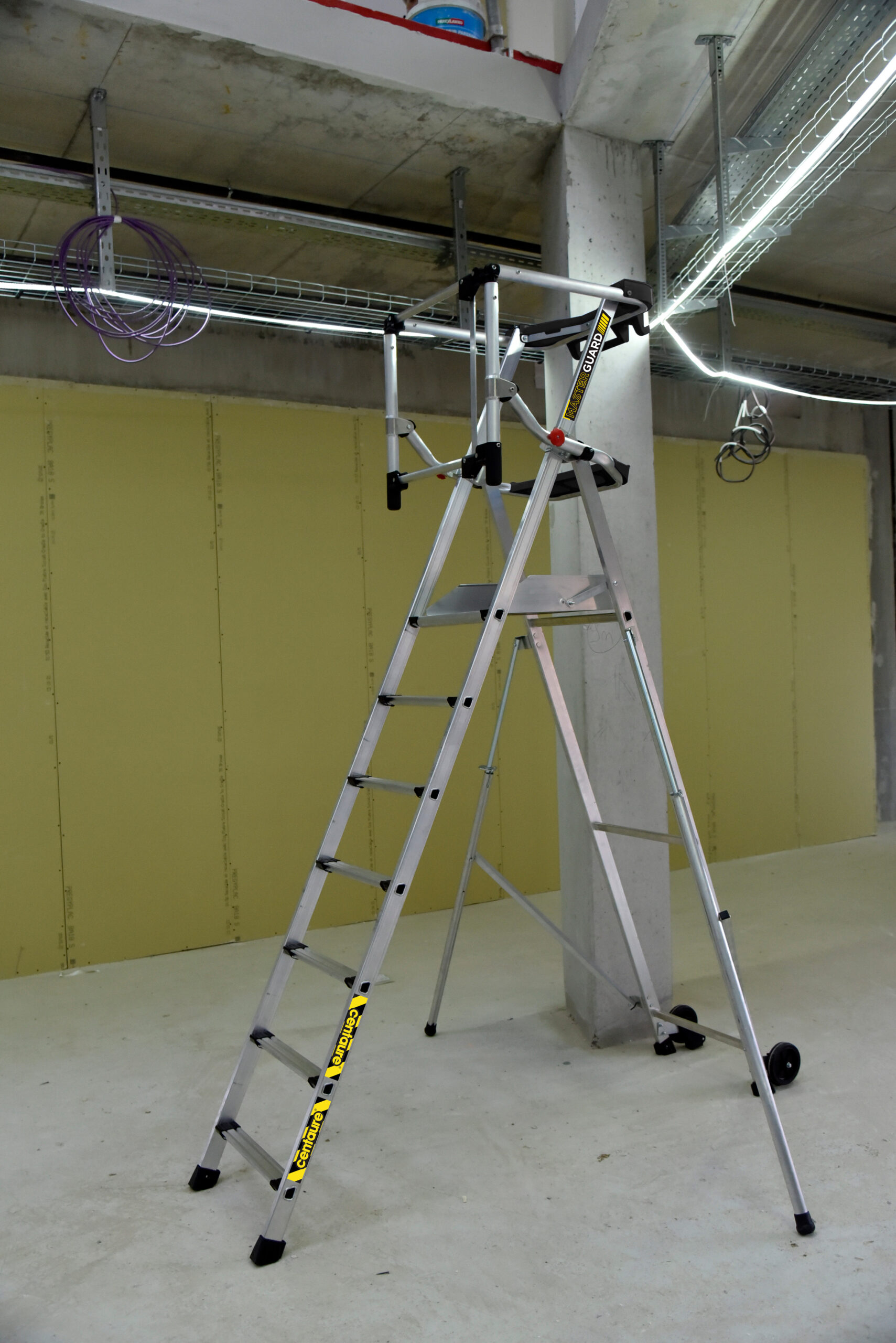 Le système de pantographe breveté à fermeture automatique permet d'accéder facilement et confortablement sur le plancher. Il permet également une protection 360° de l'opérateur. L'accès au plancher antidérapant (0,40 x 0,50 m) se fait par de larges marches antidérapantes de 60 mm. Les roues (diamètre 150 mm) facilitent les déplacements en position ouverte ou fermée sur les chantiers professionnels. Les déplacements sont également facilités grâce à sa poignée de transport. Les stabilisateurs s'adaptent automatiquement à tous types d'environnements et se replient totalement le long des montants pour le transport ou le travail dans les espaces réduits. Les plates-formes sont pliables et compactes.