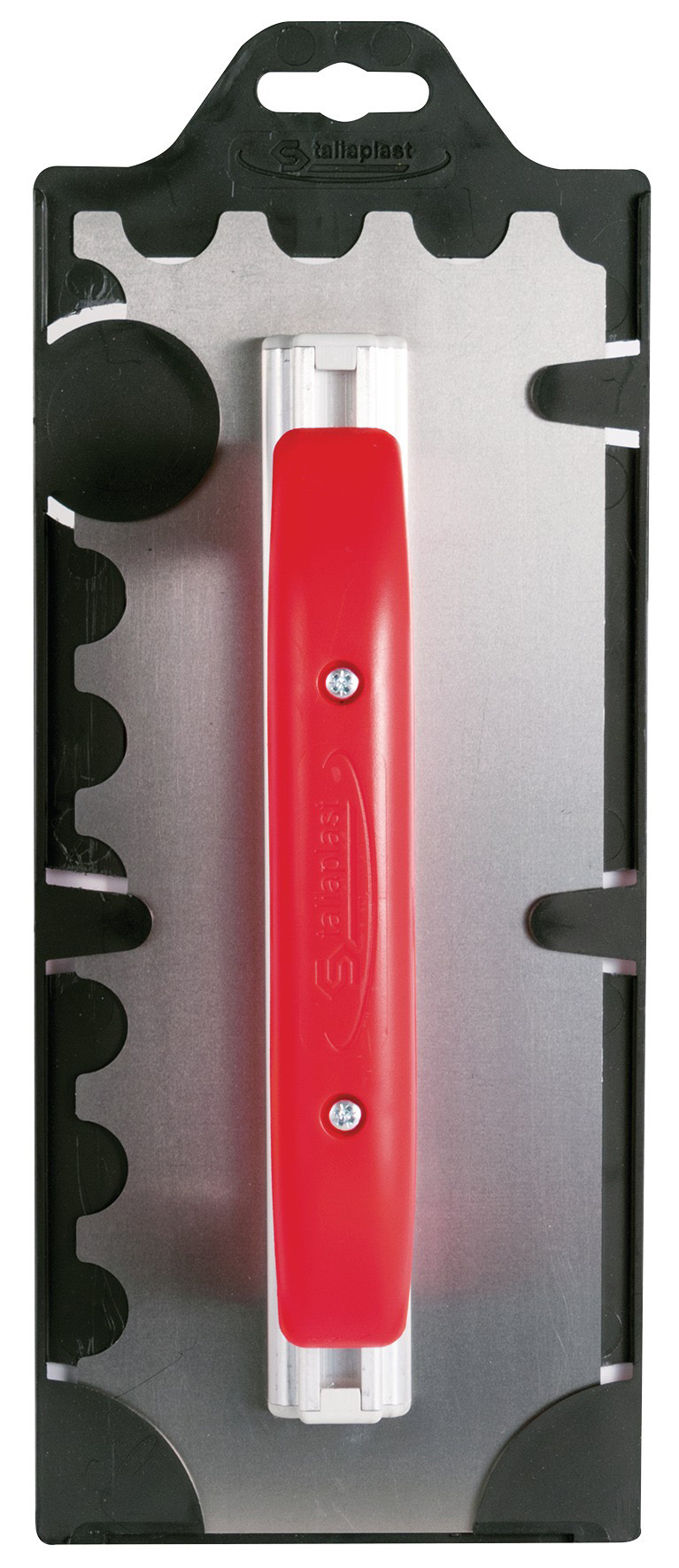 Lame INOX écroui d'épaisseur 0,7 mm de 27 x11 cm. 2 cotés dentés avec une dent dans l'angle (évite la colle dans les angles rentrants). Renfort aluminium pour une excellente rigidité, fixé avec un adhésif souple ultra résistant garanti indécollable. Poignée large, confortable et réglable sur le rail. Livré avec porte platoir.