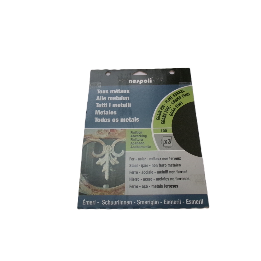 Découvrez la pochette de 3 feuilles de toile émeri grain fin 100 de NESPOLI, idéale pour le travail des métaux rouillés.