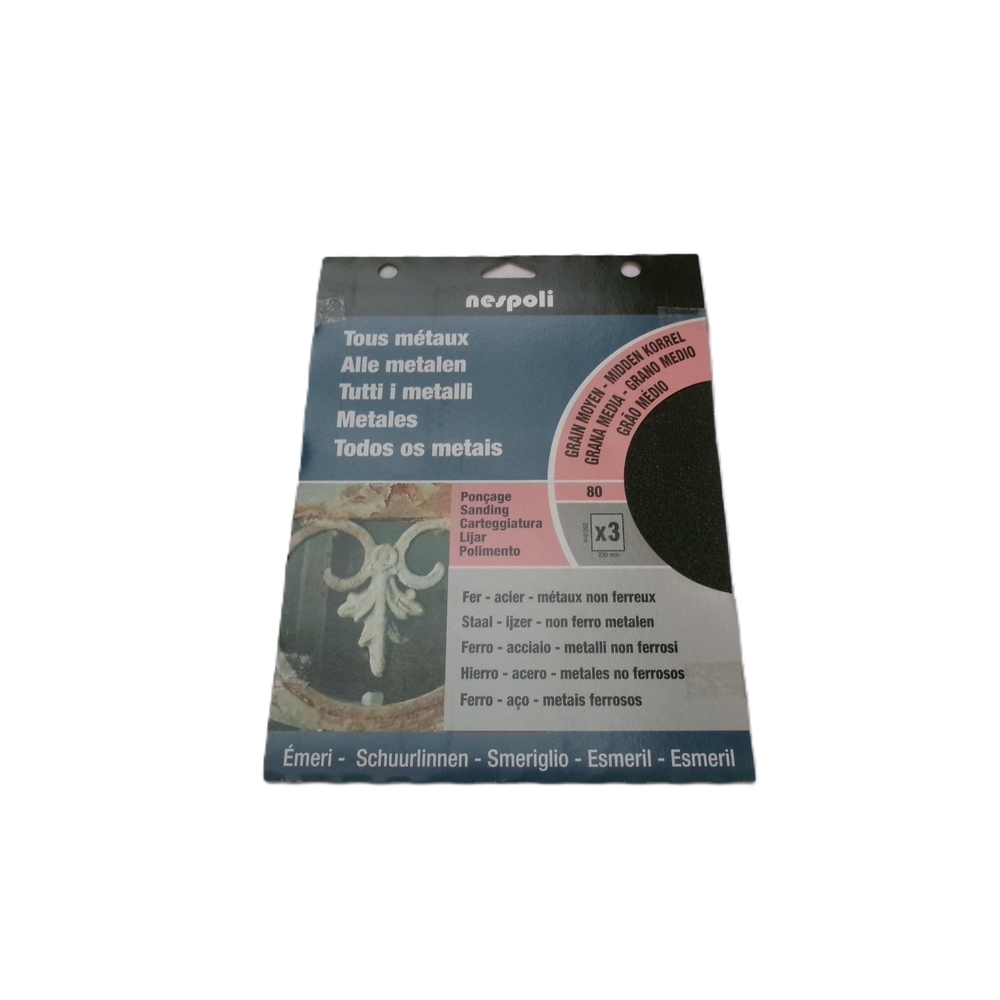Découvrez la pochette de 3 feuilles de toile émeri grain moyen 80 de NESPOLI, idéale pour le traitement des métaux rouillés.