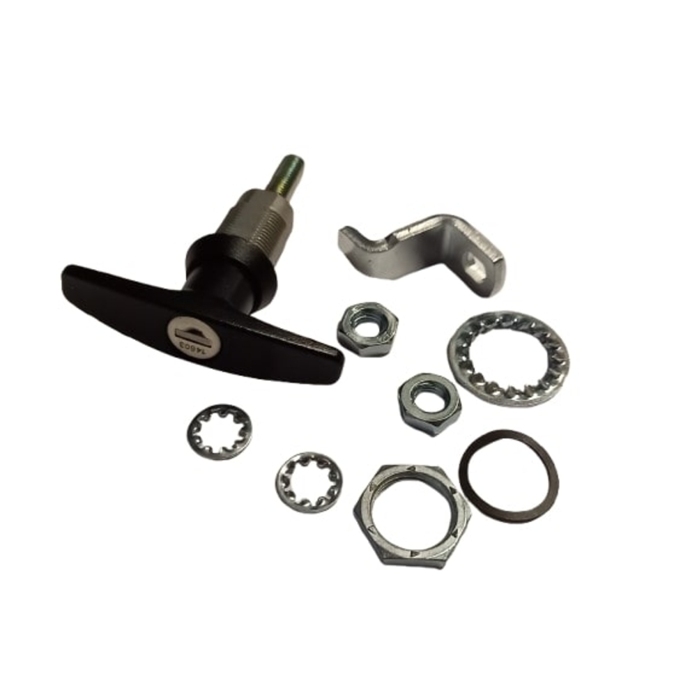 Le kit comprend la poignée elle-même ainsi que plusieurs pièces métalliques de fixation, comme des écrous et rondelles, garantissant une installation robuste.