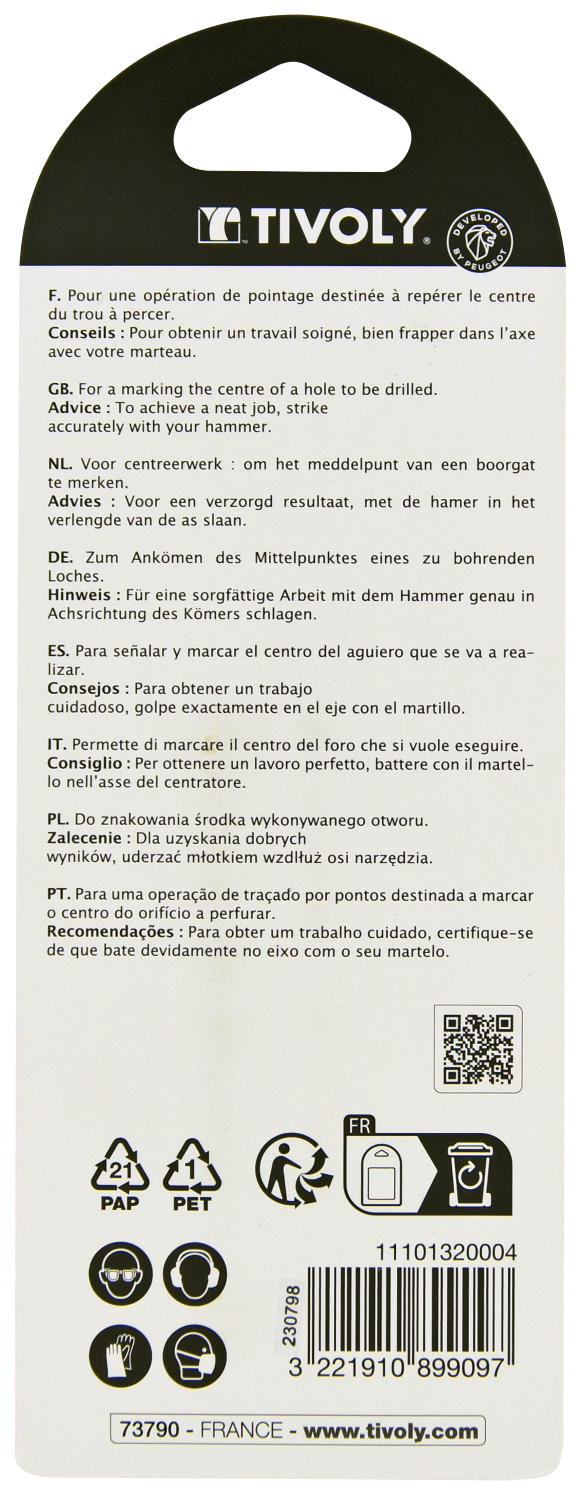 Ce pointeau Ø 12-14 est conçu spécifiquement pour une utilisation efficace lors de vos travaux de perçage. Pour un fonctionnement optimal, placez le pointeau sur le repère souhaité et frappez légèrement pour marquer le métal.