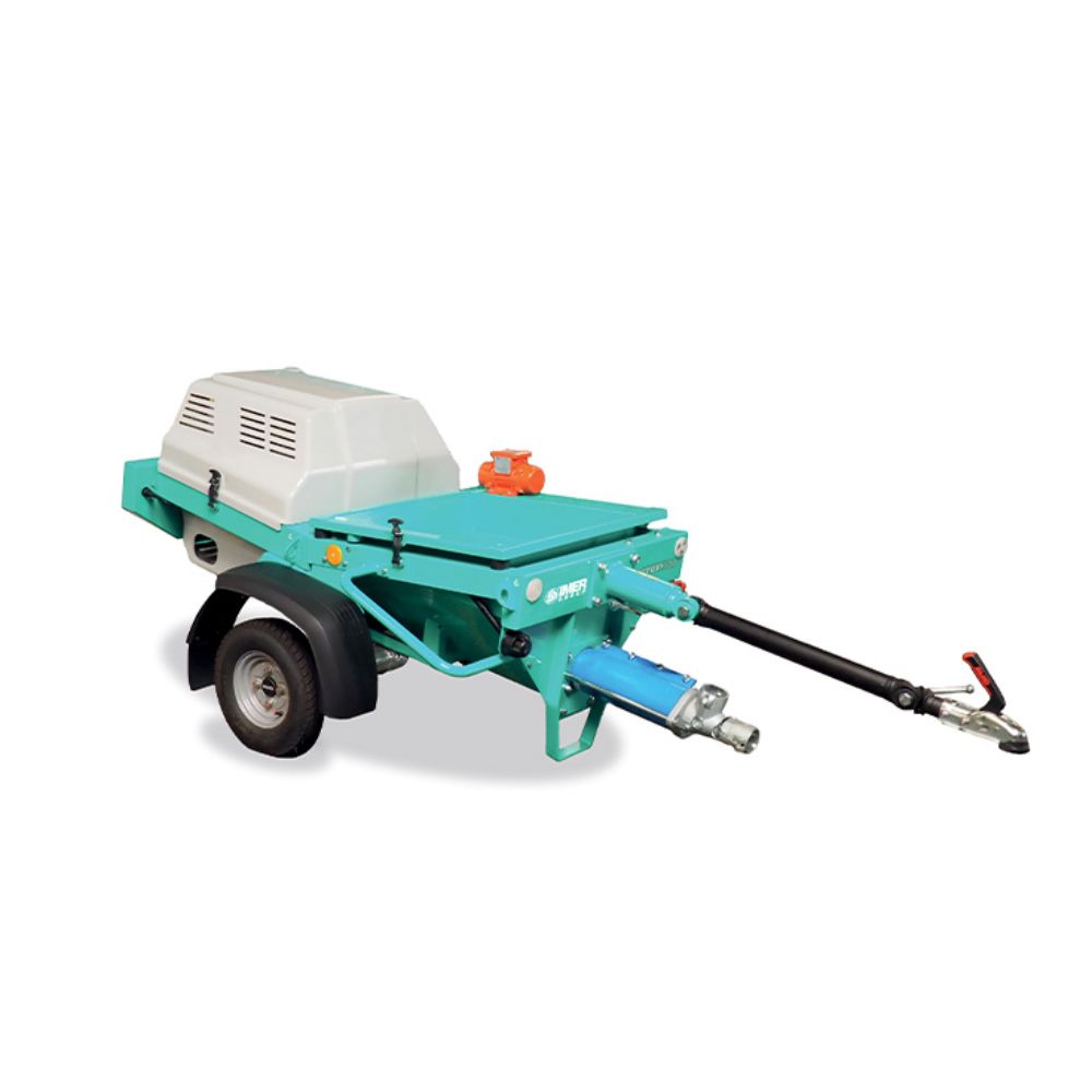 Ce modèle est livré en version monophasée avec un tableau de commande électrique équipé d’un inverter. Il est doté d’une vis et d’une jaquette adaptées aux enduits traditionnels (IML 25), d’une lance pour enduit traditionnel ou prêt à l’emploi, d’un tamis vibrant, d’un compresseur 250 l/min, ainsi que d’un ensemble de tuyaux comprenant 30 mètres (20+10) de tuyau à matériaux de 35 mm de diamètre avec raccords à cames, et 30 mètres de tuyau d’air de 13 mm de diamètre avec raccords rapides. Une caisse d’accessoires complète la dotation pour la projection d’enduits traditionnels. La machine est tractable avec une homologation routière permettant une vitesse maximale de 90 km/h. Elle nécessite une puissance minimale de groupe électrogène de 6 kW pour son fonctionnement. La distance maximale de pompage peut atteindre jusqu’à 60 mètres selon les conditions d’utilisation. Cette pompe à vis est adaptée aux applications exigeant une projection efficace et contrôlée de matériaux variés, offrant robustesse, mobilité et polyvalence pour les travaux de construction et de rénovation.