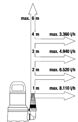 Afin de drainer rapidement et efficacement les eaux claires (si particules jusqu’à 5 mm de diamètre maximum), la pompe de drainage est dotée d’un moteur de 300 W de puissance, d’un débit maximal de 9000 l/h, d’une hauteur manométrique de 6 m et d’une pression maximale de 0,6 bar. Elle permet d’évacuer la quasi-totalité de l’eau dans la pièce : jusqu’à 2 mm.