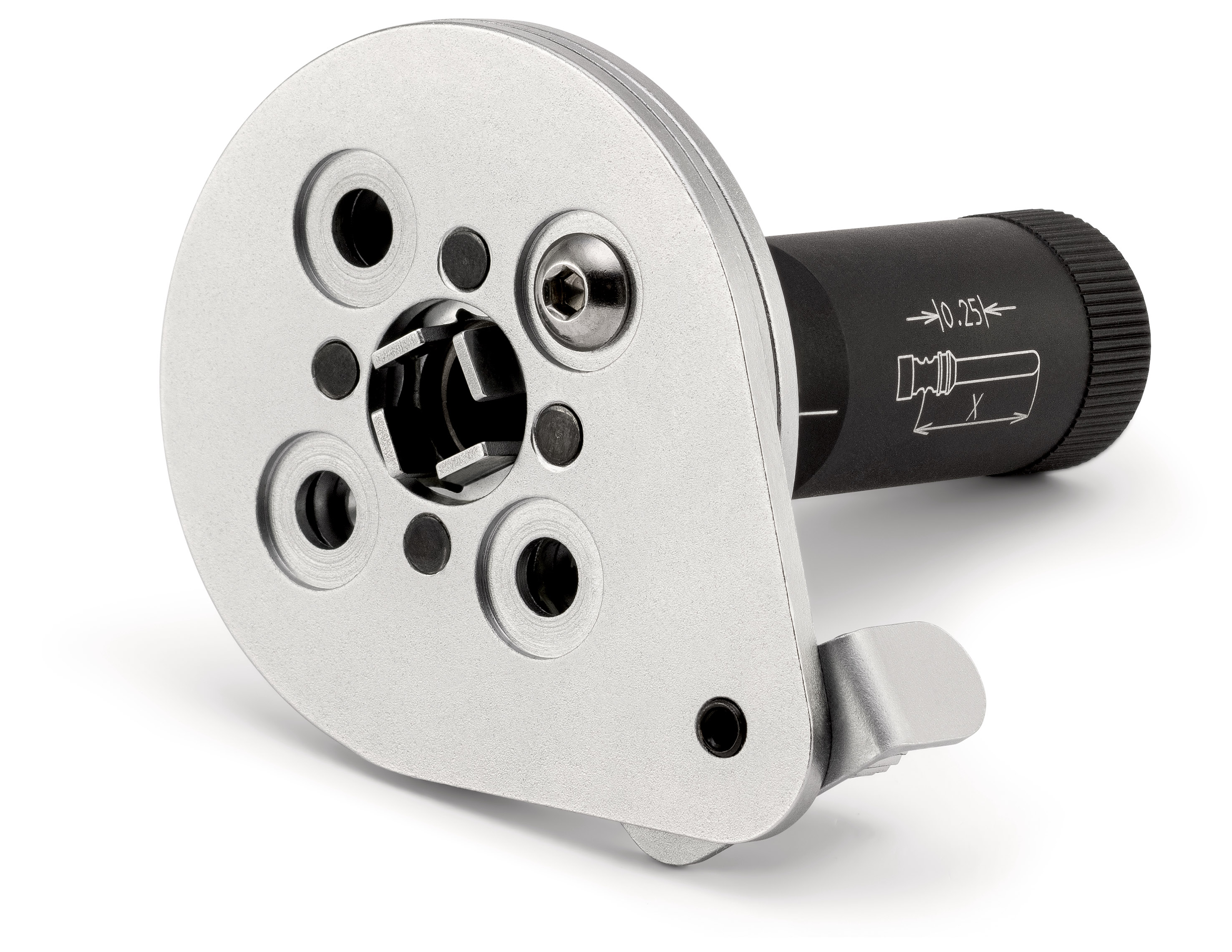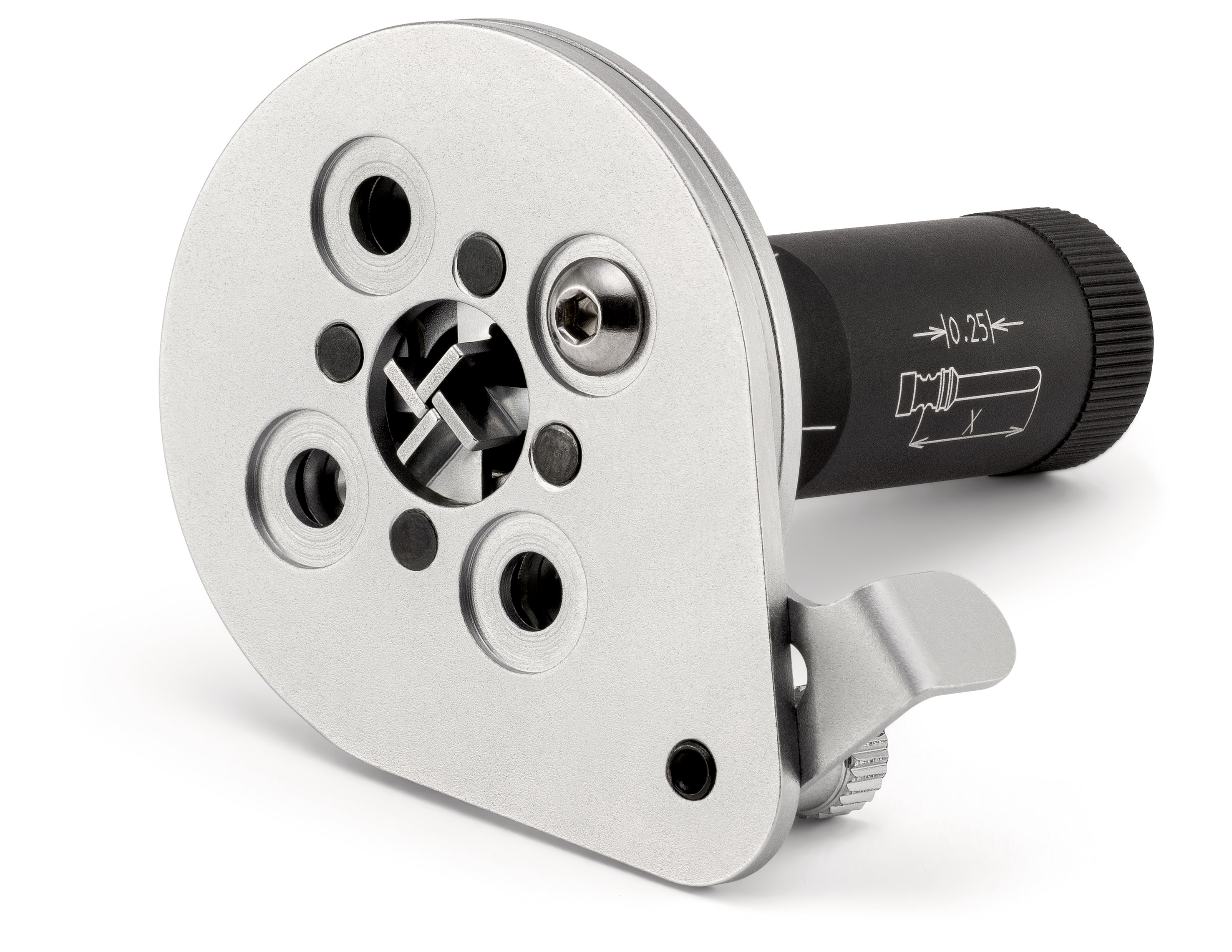 Positionneur universel pour sertissage répétitif avec un alignement exact des contacts tournés dans la pince à sertir. Ce positionneur est réglable individuellement en diamètre et en profondeur pour s’adapter précisément aux contacts, garantissant un alignement central optimal. Il est idéal pour les petites séries, les prototypes et les contacts de dimensions variées, offrant une utilisation simple et flexible sur les pinces à sertir.
