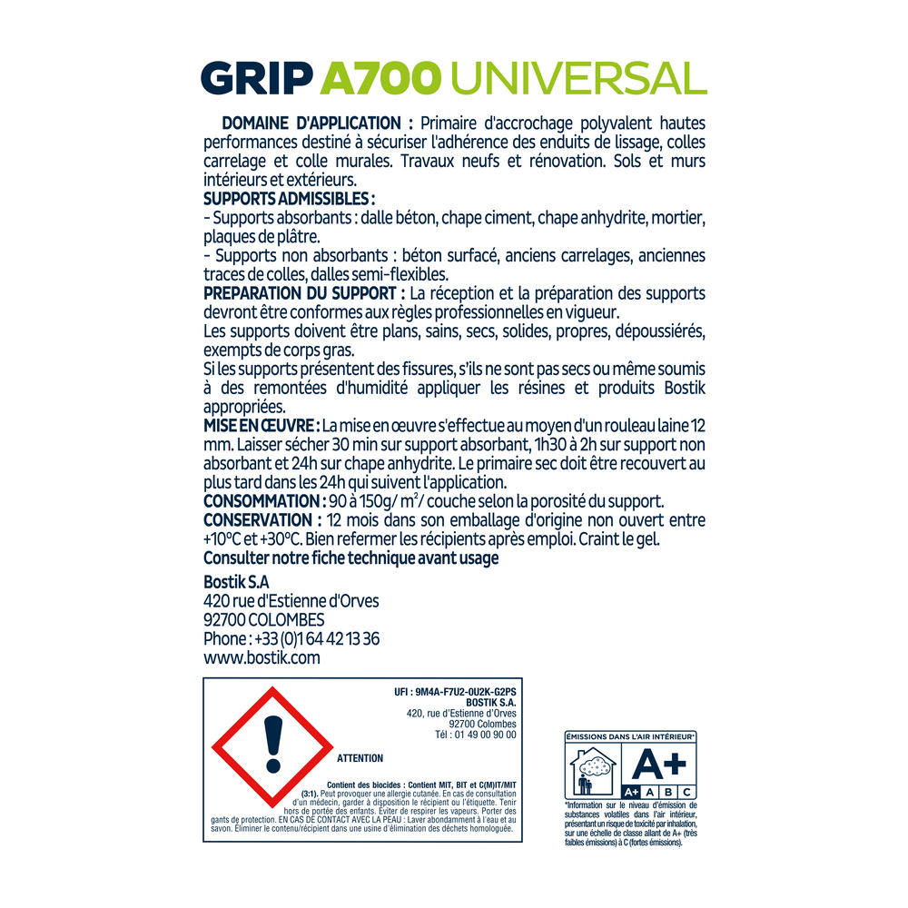 Le Primaire Grip A700 Universal de BOSTIK est un agent préparatoire polyvalent, idéal pour tous vos travaux de sol.