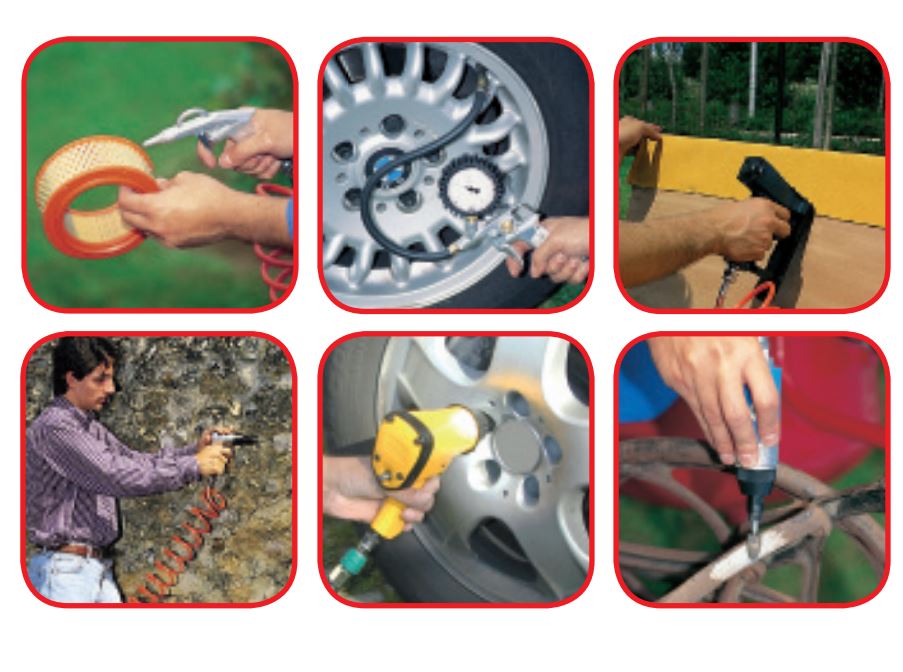Le compresseur est adapté à de multiples usages courants et occasionnels, notamment : souffler, gonfler, clouer, agrafer, crépir, peindre en « Pro », pulvériser, buriner, utiliser une clé à choc, une meuleuse droite, visser, percer, sabler et poncer.
