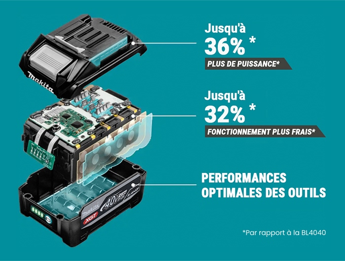 La batterie BL4040F est dotée de cellules "Tabless" qui évitent la concentration de courant en connectant toute l'extrémité de l'électrode à l'extrémité de la cellule plutôt qu'aux languettes. Cela améliore l'efficacité de la batterie, la gestion thermique et les performances globales de la batterie. Cela offre jusqu'à 36 % de puissance en plus et jusqu'à 32 % de fonctionnement plus frais que la BL4040, tout en conservant la même taille et le même poids.