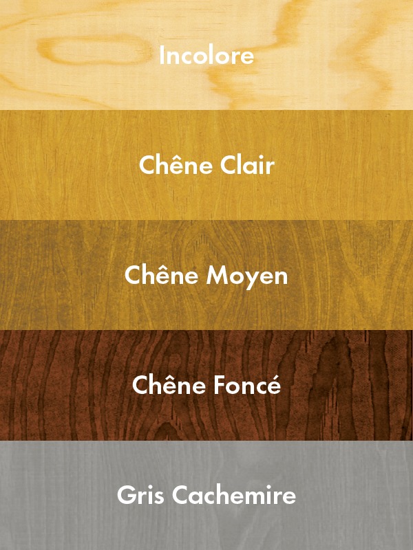 Existe en 5 coloris : incolore, chêne clair, chêne moyen, chêne foncé et gris cachemire