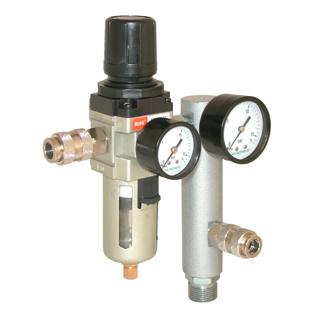 Le filtre régulateur intégré assure une double fonction : filtrer l'air avec un seuil de filtration de 25 microns, et réguler la pression. Il est muni d'une purge manuelle pour l'entretien. Le débit maximal est de 72 m³/h (1 200 l/min).