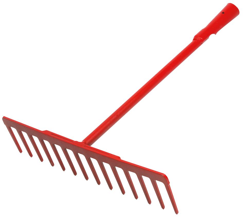 Le râteau est équipé d’une douille longue forgée et de dents épaisses et rigides, offrant une large capacité de travail. Il comporte 14 dents avec une longueur de 90 mm chacune et une largeur totale de peigne de 400 mm. Le manche en bois mesure 1500 mm de longueur avec un diamètre de 28 mm, référence du manche seul : 6941150001.