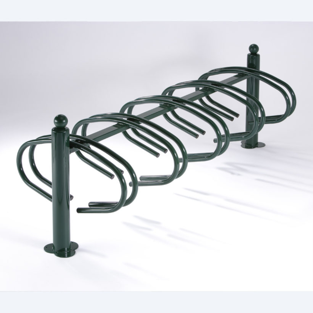 Conçu en métal et fonte, ce modèle à platine assure robustesse et durabilité. L'entraxe de 37,5 cm entre les vélos offre un agencement pratique et fonctionnel. Ce râtelier est également traité avec une finition galva et peint en vert, garantissant une résistance aux intempéries et une intégration harmonieuse dans tout environnement urbain.