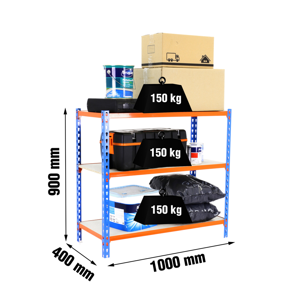 Le rayonnage mesure 900 mm de large, 1000 mm de haut et 300 mm de profondeur, avec des dimensions d'utilisation de 877x1100x310 mm. Les étagères sont constituées de panneaux de aggloméré de 12 mm d’épaisseur, assurant robustesse et durabilité. Ce produit est fabriqué selon des standards européens de qualité.