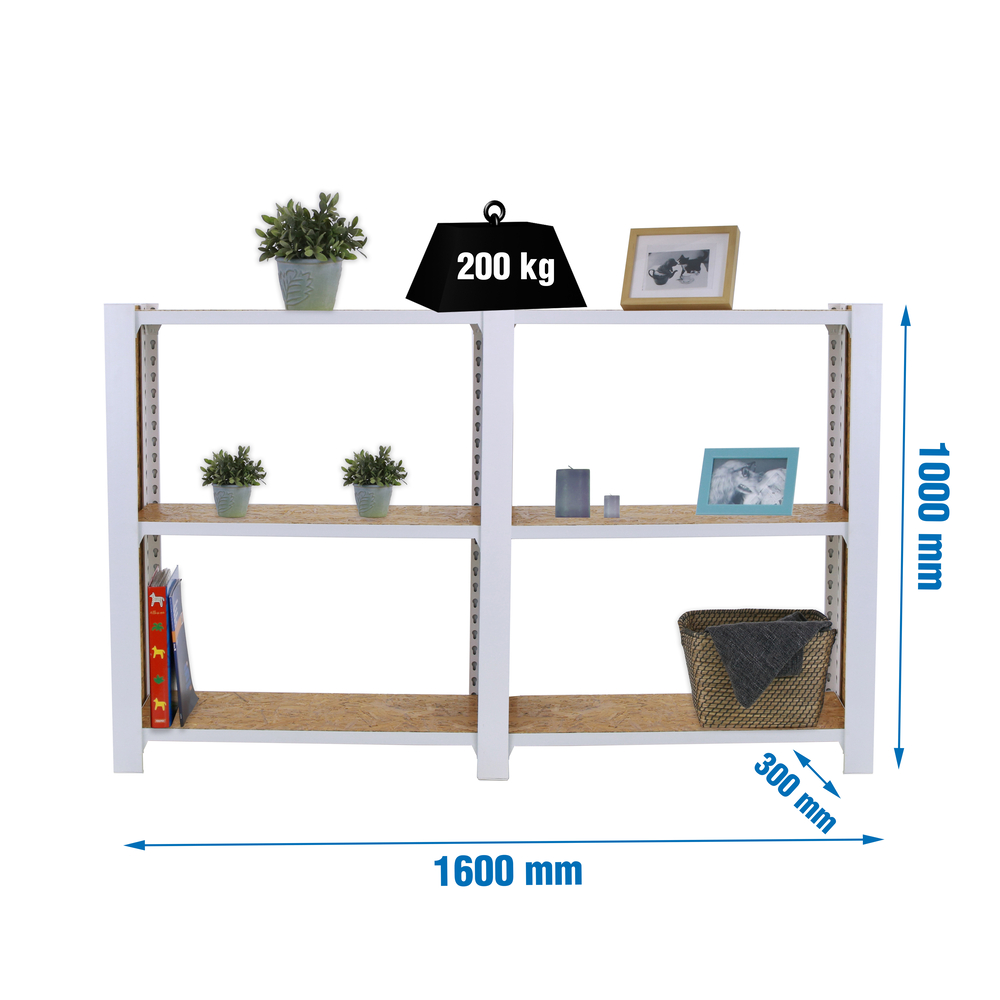 Dimensionné à 1000x1600x300 mm, le rayonnage est fabriqué en bois OSB d'une épaisseur de 15 mm, offrant robustesse et durabilité. Il possède un profil double en forme de T et est revêtu d’époxy polyester, garantissant une finition sans arêtes vives pour une manipulation sécurisée. Ce produit, sans besoin d'ancrage, est conçu pour rester stable et ne nécessite pas de fixation murale. Il est certifié selon des normes de qualité européenne.