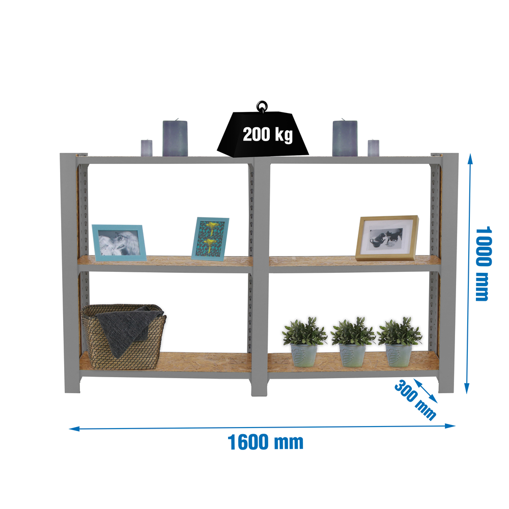 D'une dimension de 1000x1600x300 mm, ce rayonnage possède trois niveaux, chacun pouvant supporter jusqu'à 200 kg. Les plateaux en bois (OSB) de haute performance mesurent 15 mm d'épaisseur. Ce produit européen est conçu avec un profil double en forme de T et un revêtement époxy-polyester, assurant sa durabilité et sa résistance. Ses côtés de 1000 mm de haut ajoutent à sa capacité de rangement tout en conservant une allure élégante. Les instructions de montage sont incluses, rendant l'assemblage simple et rapide.