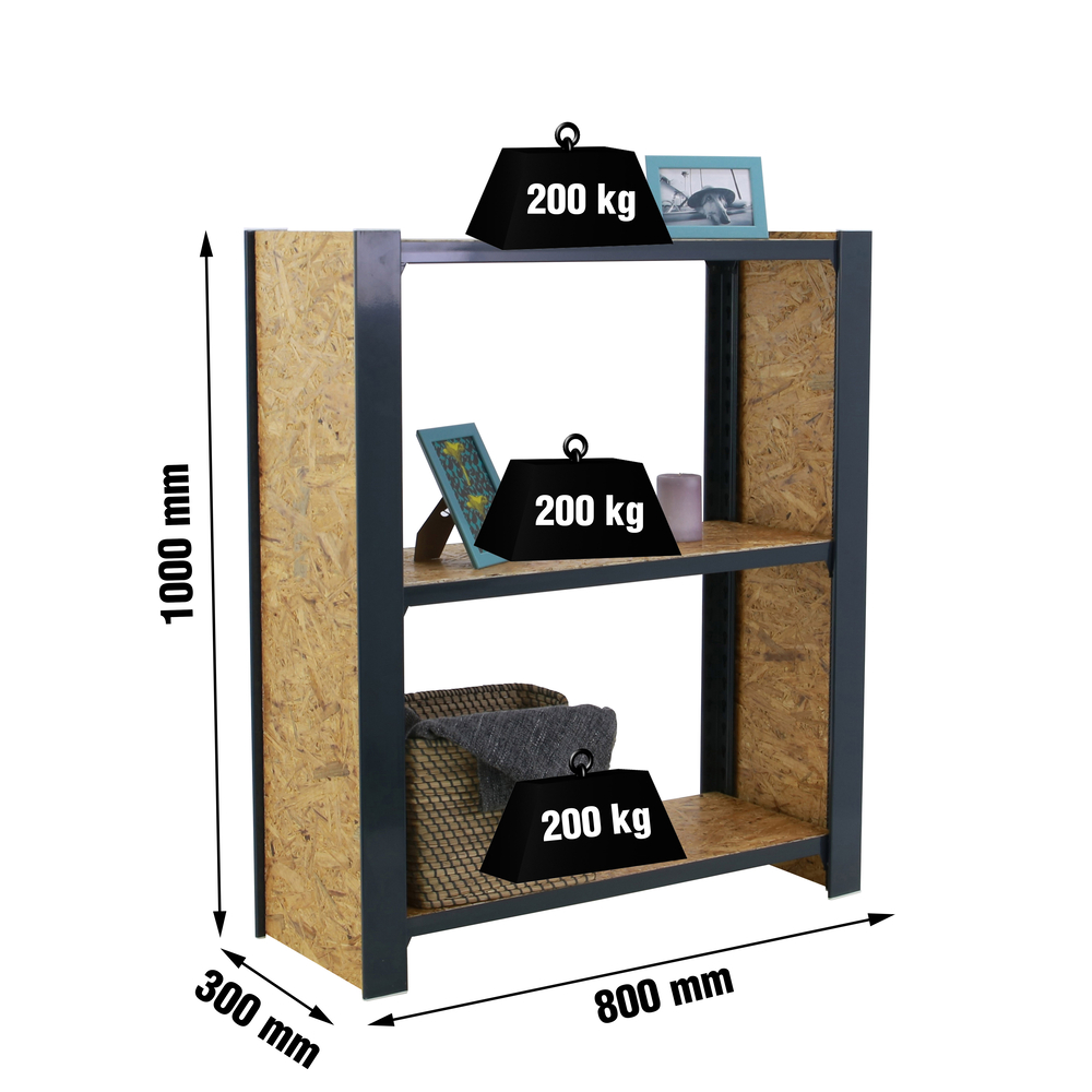Les dimensions du produit sont de 1000 mm de hauteur, 800 mm de largeur et 300 mm de profondeur. Le plateau en bois de qualité (OSB) a une épaisseur de 15 mm, garantissant robustesse et durabilité. Ce rayonnage, avec son design industriel, s’intègre harmonieusement dans des environnements modernes ou vintage. Son profil double en forme de T, revêtu d'époxy-poliester, assure une robustesse sans arêtes tranchantes, permettant une manipulation sécurisée. De plus, il est stable et ne nécessite pas d'ancrage mural. Les instructions de montage sont fournies à l'intérieur. Ce produit bénéficie d'une certification de qualité européenne.