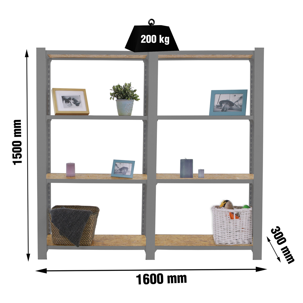 Dimensions : 1500 mm de hauteur, 1600 mm de largeur et 300 mm de profondeur. Il comprend 4 niveaux, offrant un total de 8 étagères avec des plateaux en bois OSB de 15 mm d'épaisseur, et un design qui s'intègre parfaitement dans des décors modernes ou vintage. Avec un profil double en forme de T et un revêtement en époxy-polyester, ce rayonnage est non seulement esthétique mais également sûr, sans arêtes coupantes, et ne nécessite pas d’ancrage murale. Produit conforme aux standards de qualité européens.
