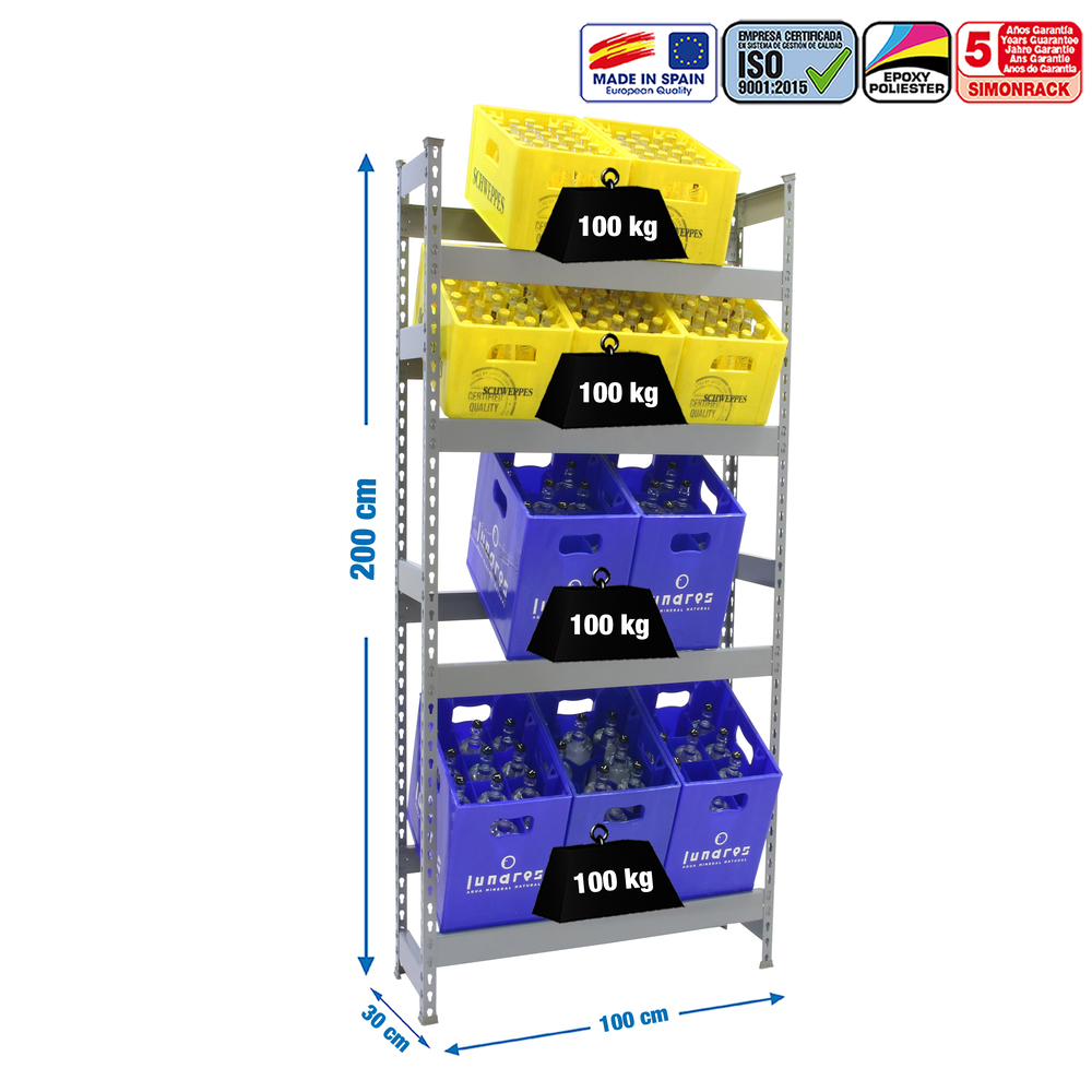 Rayonnage léger tri de bouteille sans vis 2000x1000x300 - 4 niveaux Gris - SIMON RACK - 8425437087851
