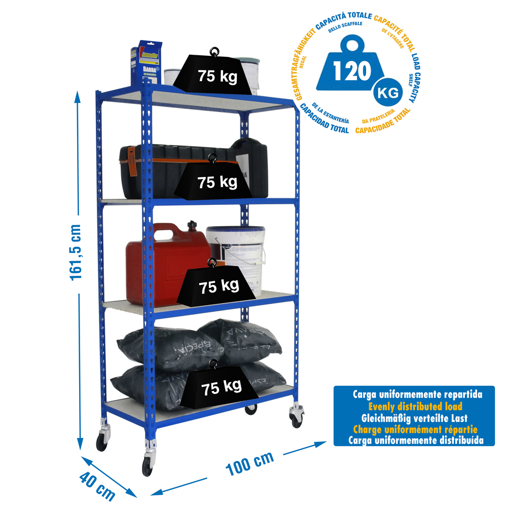 Rayonnage mobile bois-métal léger sans vis 1575x1000x400 - 4 niveaux Bleu/Bois - SIMON RACK - 8435104963579