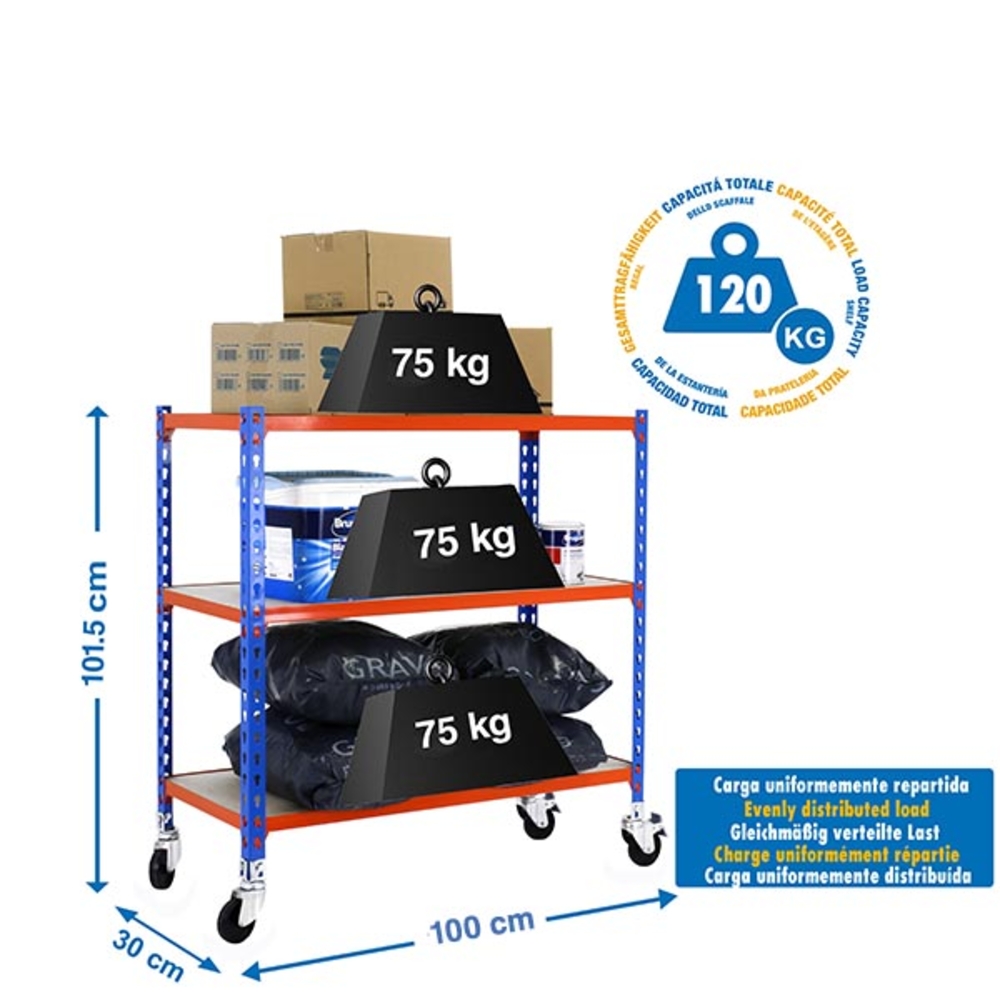 Rayonnage mobile bois-métal léger sans vis 975x1000x300 - 3 niveaux Bleu/Orange/Bois - SIMON RACK - 8435104954287