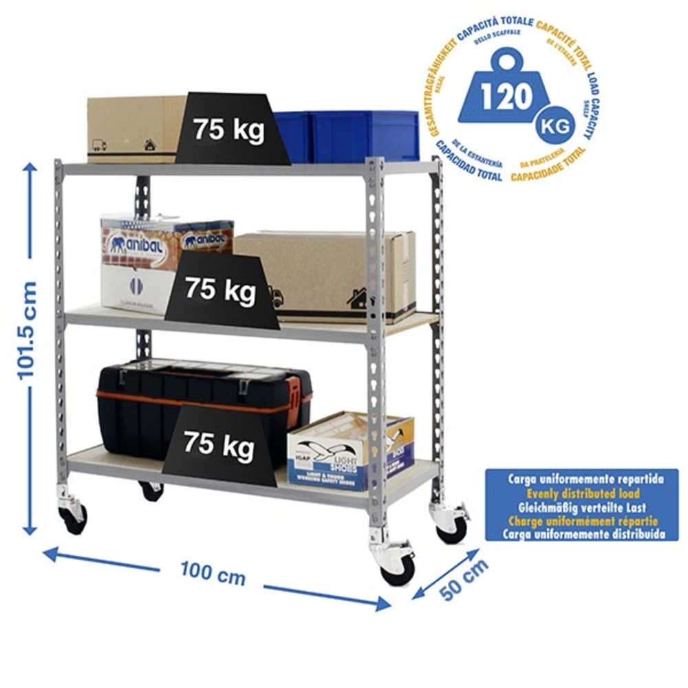 Rayonnage mobile bois-métal léger sans vis 975x1000x500 - 3 niveaux Gris/Bois - SIMON RACK - 8435104954584