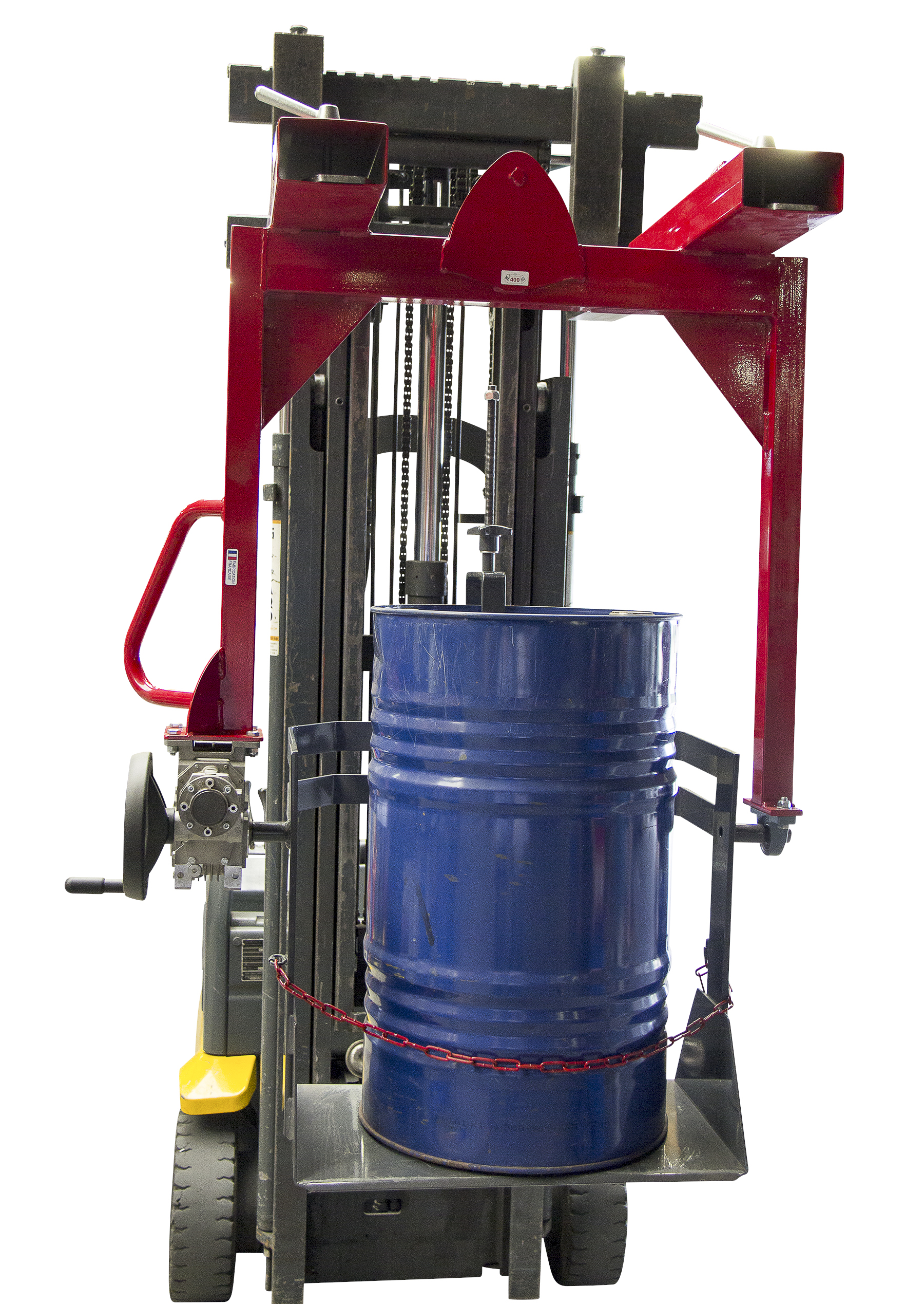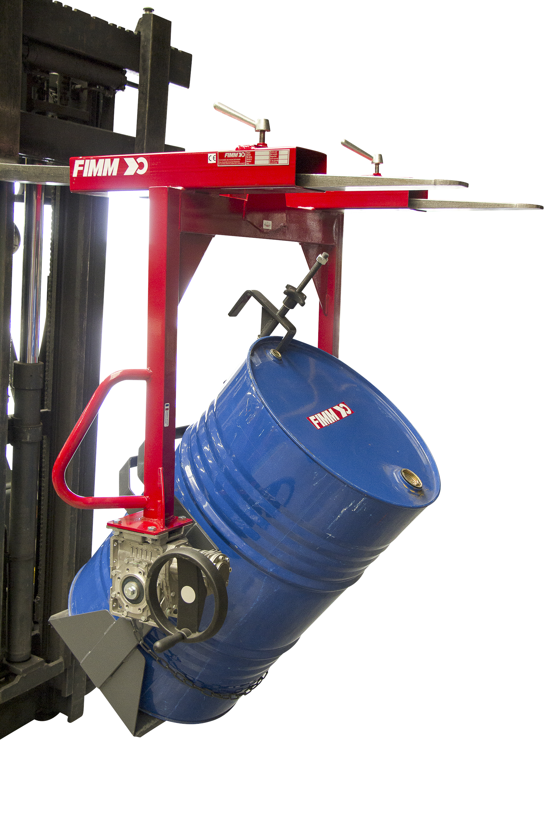 Le système d’accroche du fût se fait par serrage rapide grâce à un écrou quart de tour, ce qui permet une adaptation à tous les types de fûts. La manipulation s’effectue soit par palan, soit par chariot élévateur, offrant ainsi une préhension mixte. La commande est assurée par un volant, démultipliée par un réducteur métallique à bain d’huile, garantissant une rotation fluide de 360° avec arrêt possible dans toutes les positions.
