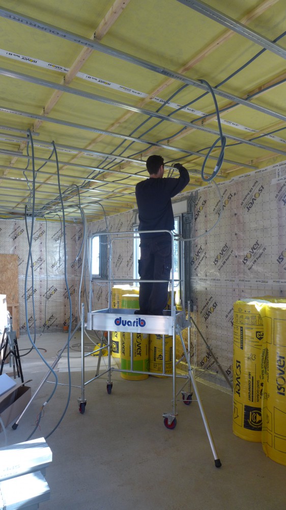 - Construction en acier galvanisé pour durabilité Base pliante avec stabilisateurs réglables Montage et démontage en toute sécurité Plancher en alu/bois avec plinthes intégrées Roues à frein pour une mobilité sécurisée