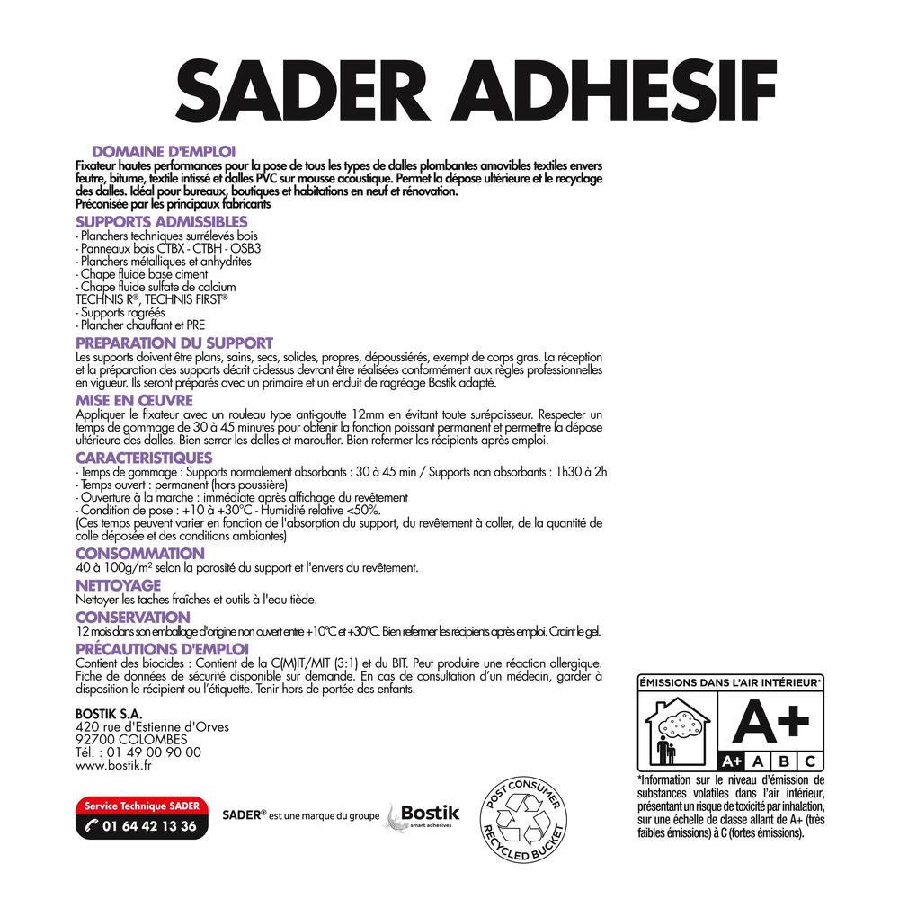 L'adhésif Sader convient aux locaux P2 et P3, garantissant des performances adéquates pour une utilisation dans des zones à trafic modéré à élevé. Grâce à son piégeage permanent élevé et à sa formulation sans solvant, il assure une excellente tenue dans le temps. De plus, sa très faible émission de COV, classée A+, en fait un choix respectueux de l'environnement.