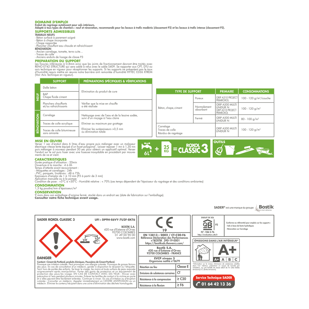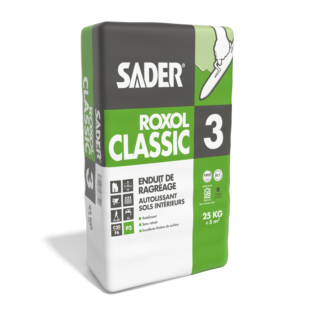 En résumé, Sader ROXOL CLASSIC 3 est un ragréage autolissant performant, polyvalent et certifié, adapté à une large gamme de supports et revêtements, garantissant une finition de qualité avec une mise en œuvre simple et flexible.