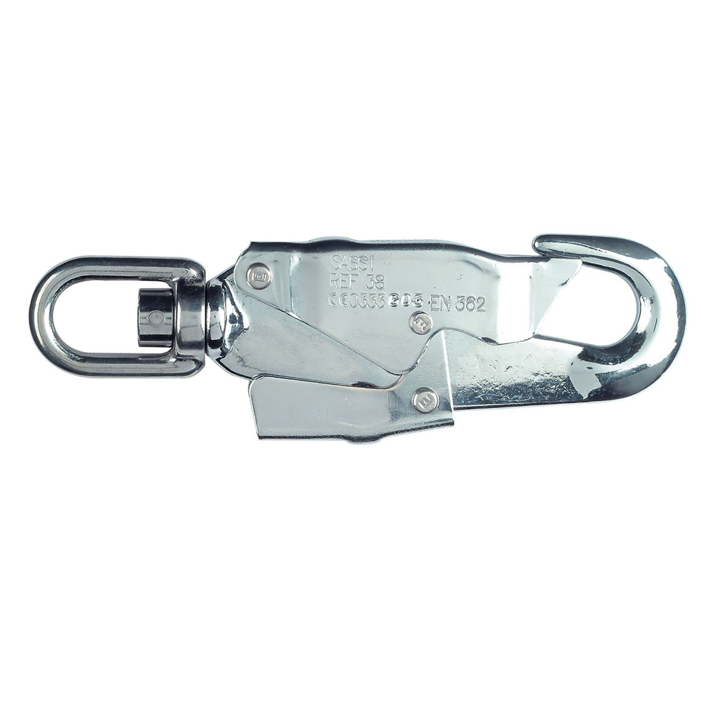 Mousqueton en acier à verrouillage automatique par double action avec émerillon rotatif. Résistance : 25 kN