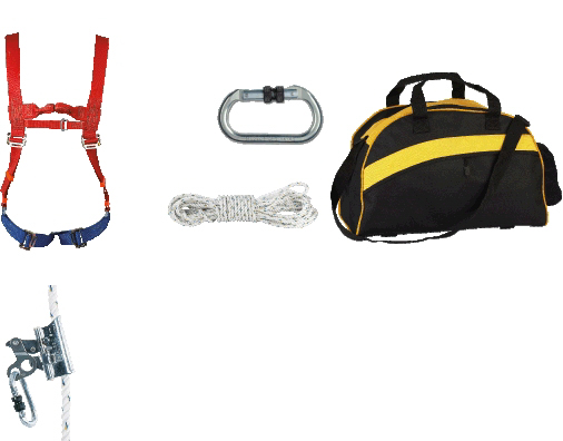 Ensemble antichute comprenant un harnais Réf. 450 avec 2 points d'accrochage, un antichute Réf. 365, un cordage diamètre 15 mm de 10 mètres équipé d'un connecteur Réf. 40, le tout dans un sac de rangement jaune et noir Réf. 119. Cet équipement est recommandé pour les travaux en façade.