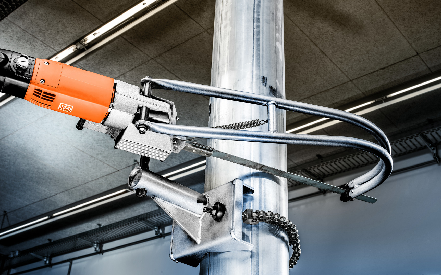 Un dispositif de serrage et d'avance est disponible pour les tubes et profilés de 80 à 400 mm de diamètre, avec la possibilité de réaliser des coupes biaises jusqu'à 45°. La livraison comprend deux lames de scie, une poignée et une clé à mandrin. L'appareil est équipé d'un entraînement électrique et d'un réglage du nombre de courses.