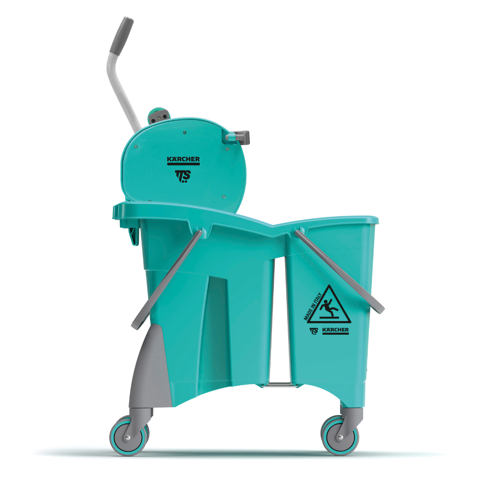 Le chariot mobile Action Pro Dry KÄRCHER – référence 92120610 est une solution professionnelle de nettoyage manuel particulièrement adaptée aux milieux moyens à grands où un rinçage efficace de la frange de lavage est requis. Il s’agit d’un seau à deux compartiments monté sur roues Ø 80 mm, équipé d’une presse ergonomique à rouleau Dry, conçue pour faciliter l’essorage tout en réduisant l’effort nécessaire de l’utilisateur, notamment au niveau du dos.