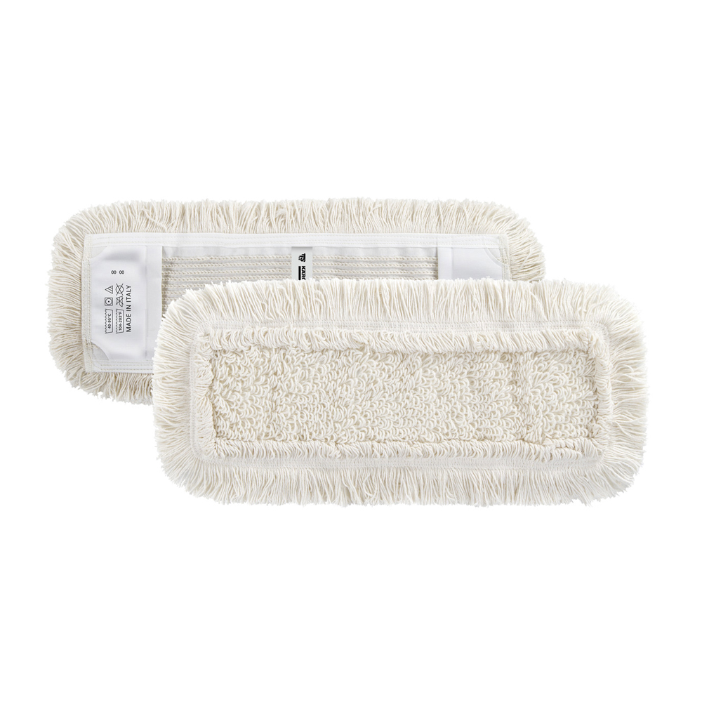 Fabriquée à partir d’un mélange de 70 % coton et 30 % polyéthylène, elle combine la douceur naturelle du coton et la résistance du polyester, assurant ainsi durabilité et performance. Cette serpillière, d’une largeur de travail de 50 cm, est munie de poches facilitant sa fixation rapide et sécurisée sur les balais à plat compatibles. Sa structure tuftée avec un fil continu à l’intérieur et coupé à l’extérieur garantit une longue durée de vie en assurant une fixation directe du fil à la couche porteuse. Cette conception technique permet également une grande capacité d’absorption, la serpillière pouvant retenir jusqu’à 250 % de son poids en liquide de nettoyage, ce qui optimise l’utilisation de l’eau et des détergents.