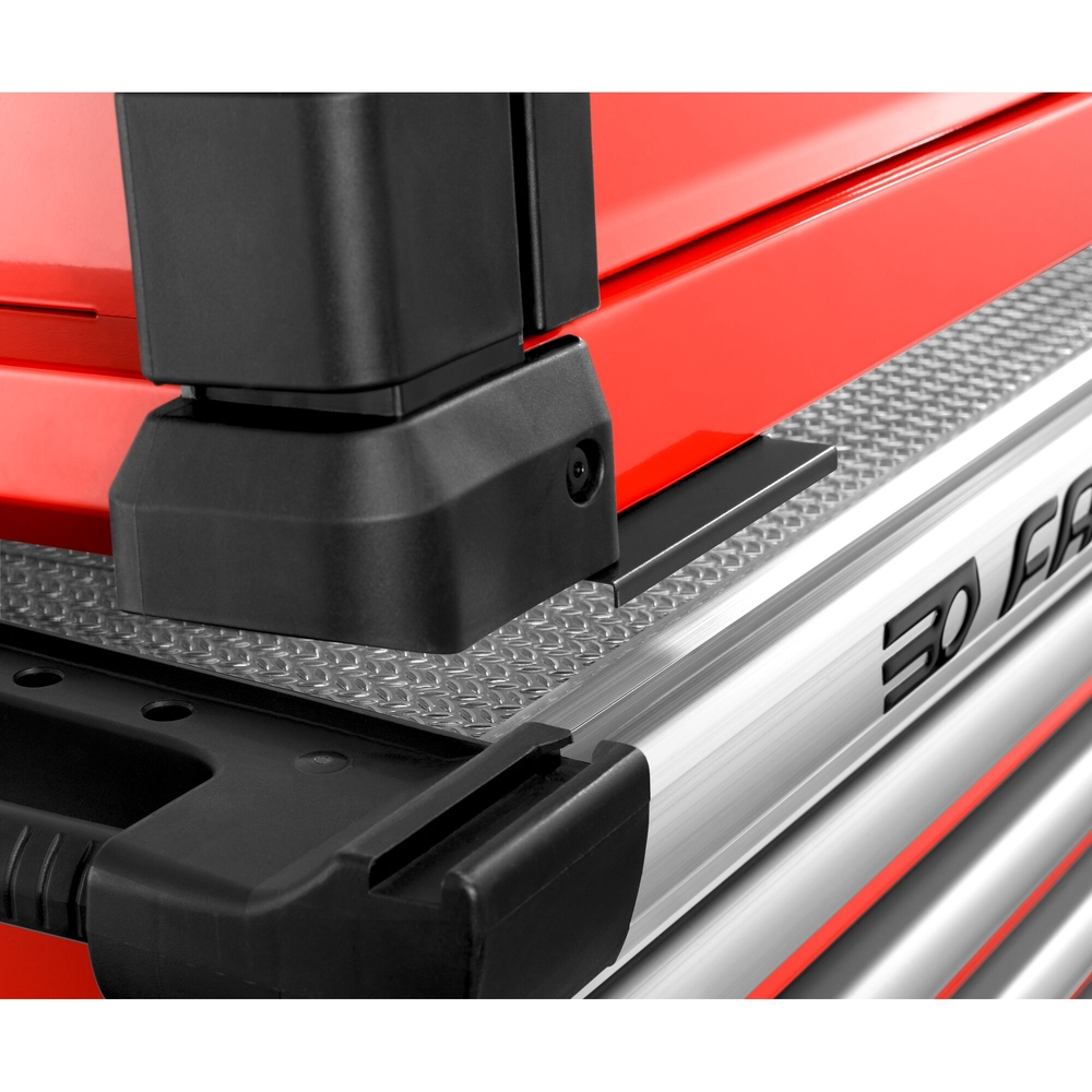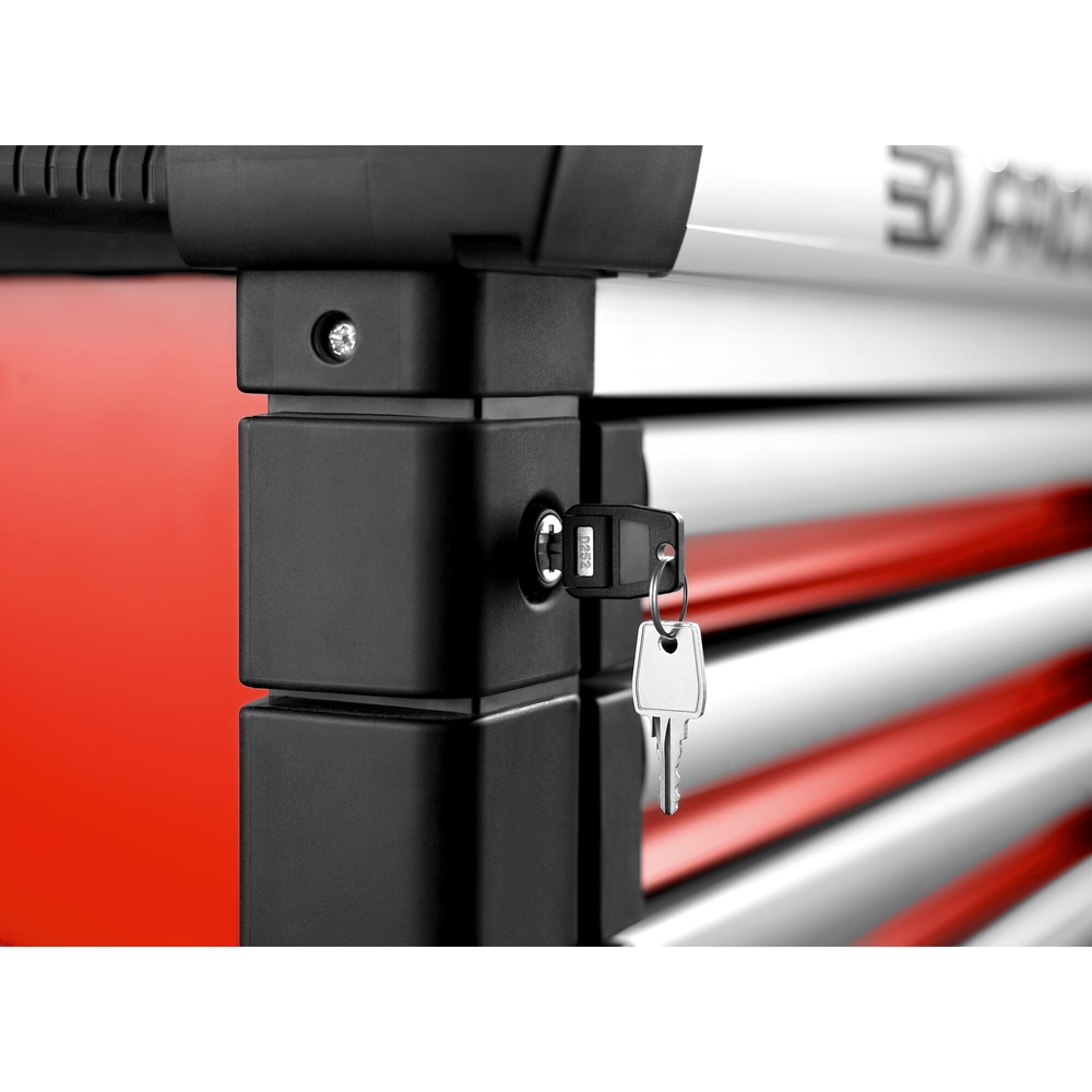 La servante JET.6M3A dispose de tiroirs de 60 mm, 130 mm et 270 mm, et d'un volume utile de rangement de 155 litres. La planche de bois de 15 mm est recouverte d'une plaque d'aluminium larmé de 2 mm, résistant aux impacts et aux hydrocarbures. Sa poignée bi-matière intégré facilite le déplacement. De plus, la fermeture se fait de manière centralisée, sécurisée par une serrure à clé, assortie de deux clés. Fabriquée en France, elle bénéficie d'une garantie de cinq ans et d'une durabilité éprouvée avec des tests de 50 000 cycles d'ouverture/fermeture.