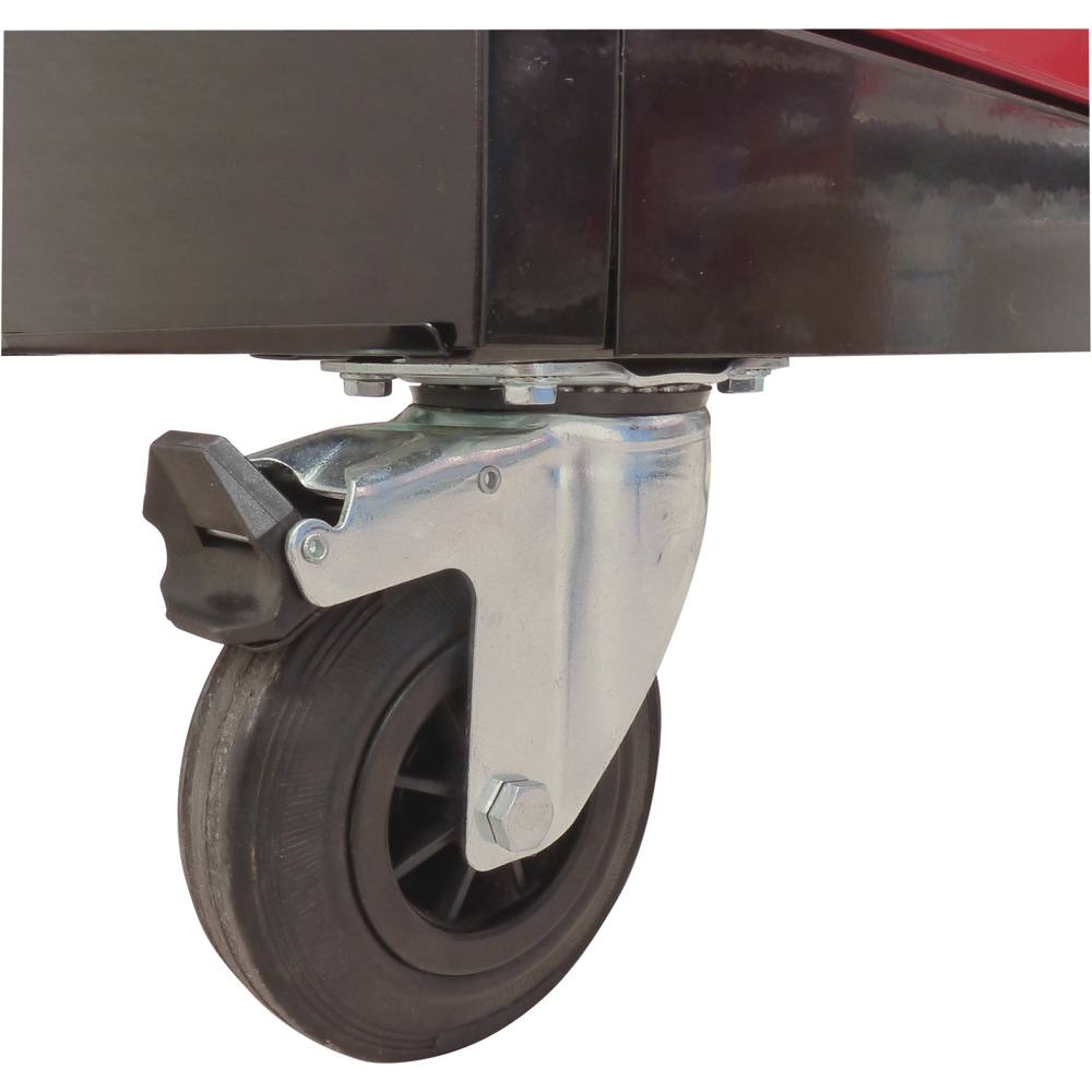 Conçue avec un plan de travail recouvert d’un tapis mousse, cette servante facilite vos tâches tout en protégeant la surface. Les sept tiroirs, dotés d'une fermeture centralisée, garantissent une organisation optimale de vos outils. La charge maximale de cette servante est de 250 kg, avec une capacité de 15 kg pour les petits tiroirs et 30 kg pour les grands. La mobilité est assurée par quatre roues de 120 mm, dont deux sont fixes et deux pivotantes (une avec frein) pour un transport aisé.
