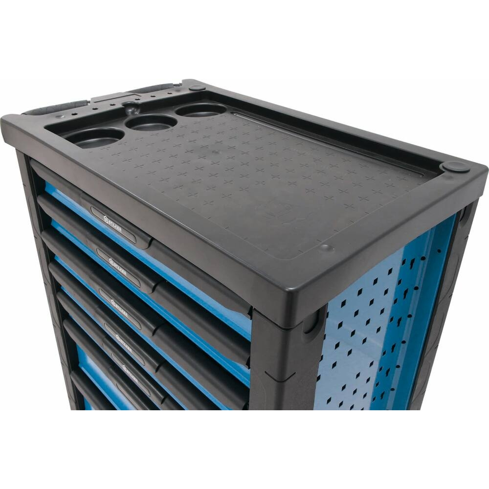 Cette servante comprend 147 outils soigneusement organisés dans 4 grands modules mousses. Sa construction en acier robuste et son plan de travail en ABS (770x470x970mm) permettent une utilisation optimale tout en offrant une charge maximale de 300 kg. Les tiroirs, aux dimensions intérieures de 535x400 mm, bénéficient d'une fermeture à clé centralisée et d'un blocage individuel pour garantir la sécurité de vos outils.