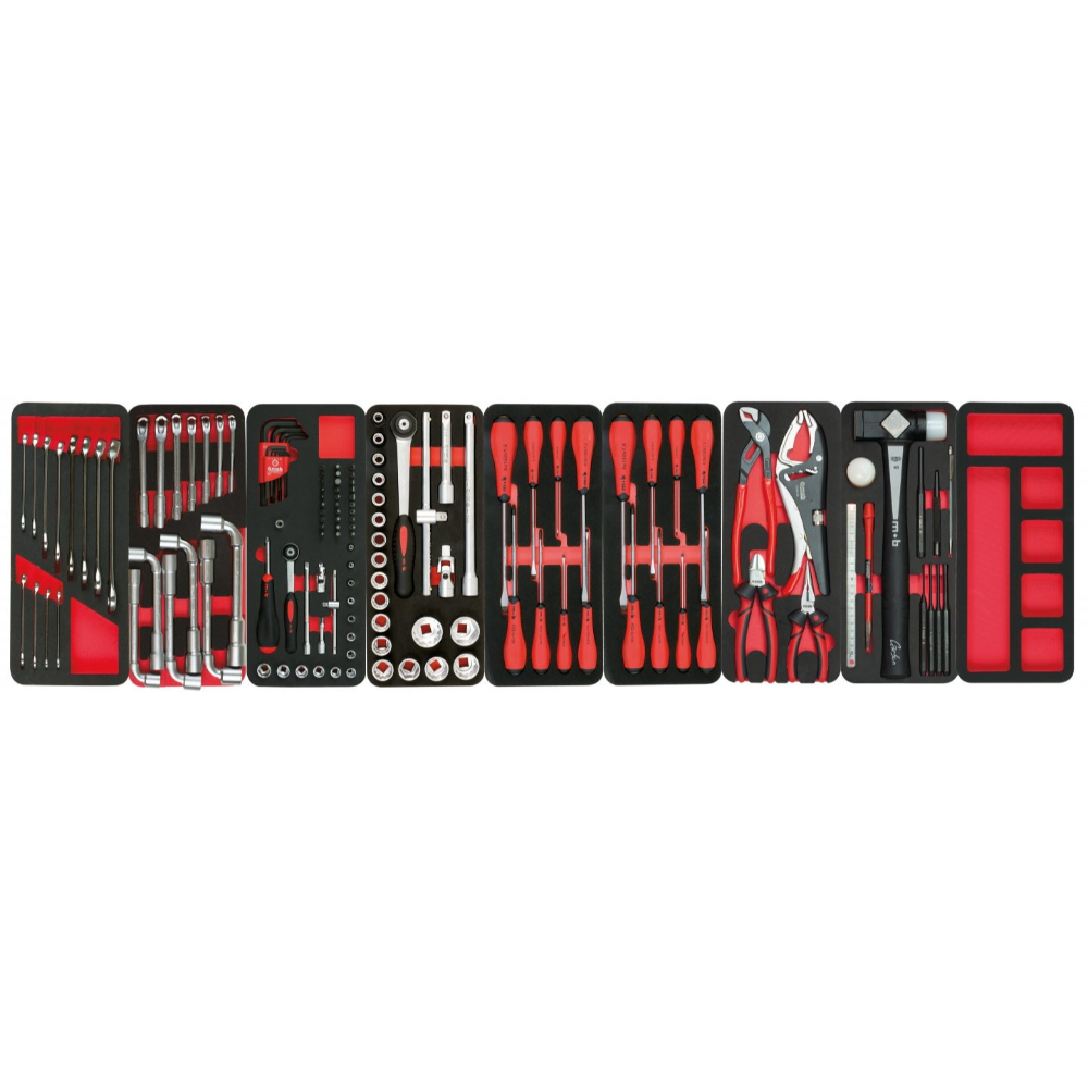 Avec sa composition de 133 pièces réparties sur 9 modules, la servante offre une grande diversité d'outils pour divers travaux. Les outils sont disposés dans une mousse bi-colore haute densité, résistant aux produits de l'atelier et permettant de repérer facilement les outils manquants grâce au fond rouge.