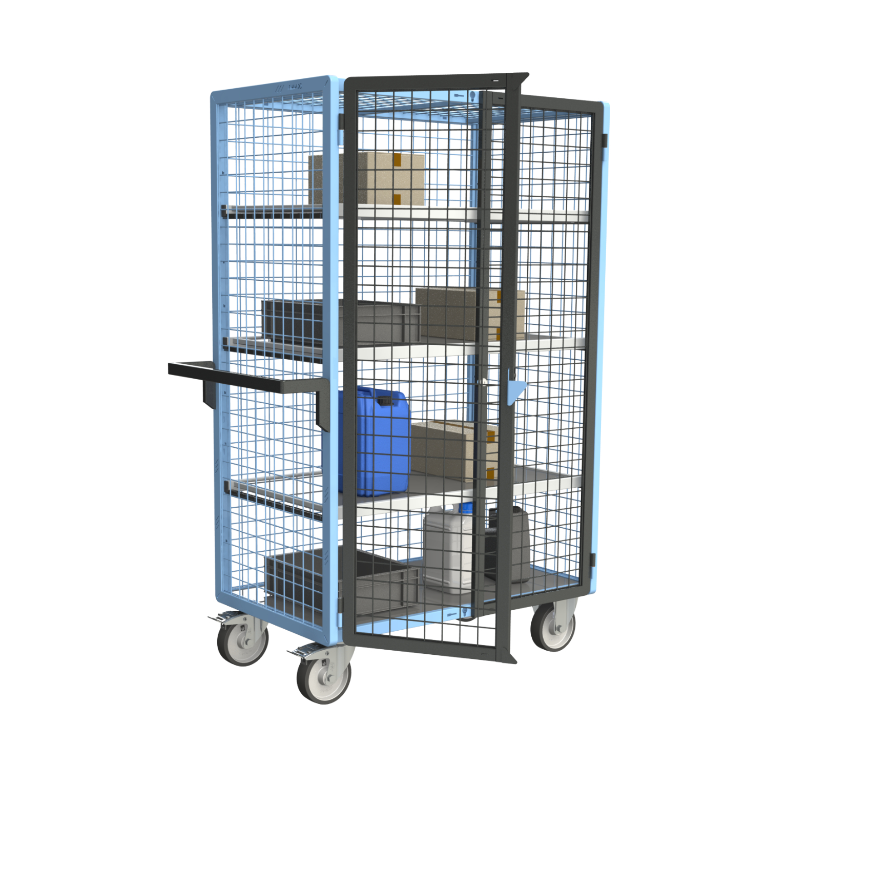 Desserte sécurisée pour le transport et le rangement, avec structure en acier mécano-soudé pour une durabilité accrue. Châssis renforcé de 35x20 mm pour une résistance optimale, même en usage intensif. Poignée ergonomique pour une manipulation aisée. Grillage en maille 50x50 mm permettant un agencement flexible des étagères, supportant jusqu'à 100 kg chacune. Verrouillage efficace avec système à 3 points et poignée intégrée, minimisant les risques d'accrochage. Mobilité facilitée par 4 roues, dont 2 pivotantes à frein, conformes à la norme EN 1757, avec revêtement TPE non marquant et réduction de l'effort de démarrage de 50%.
