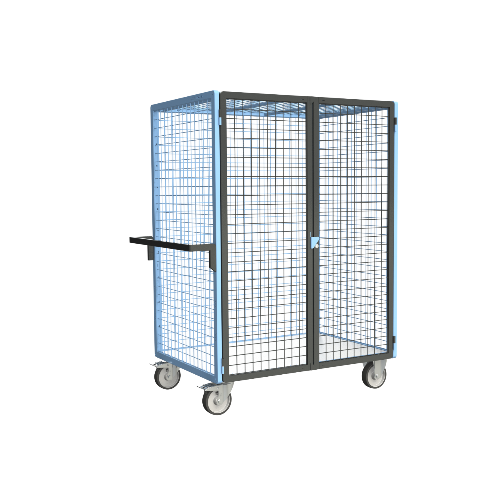 Chariot de transport et stockage, structure en acier mécano-soudé, dimensions 1200x800 mm, capacité 500 kg. Plateau en bois robuste, hauteur totale 1460 mm. Sécurisé par verrouillage 3 points, livré avec 2 clés. Équipé de 4 roues (2 fixes et 2 pivotantes avec frein) en TPE non marquantes et silencieuses, réduisant l'effort de démarrage de 50%. Maille de grillage 50x50 mm pour une modularité des étagères optionnelles.