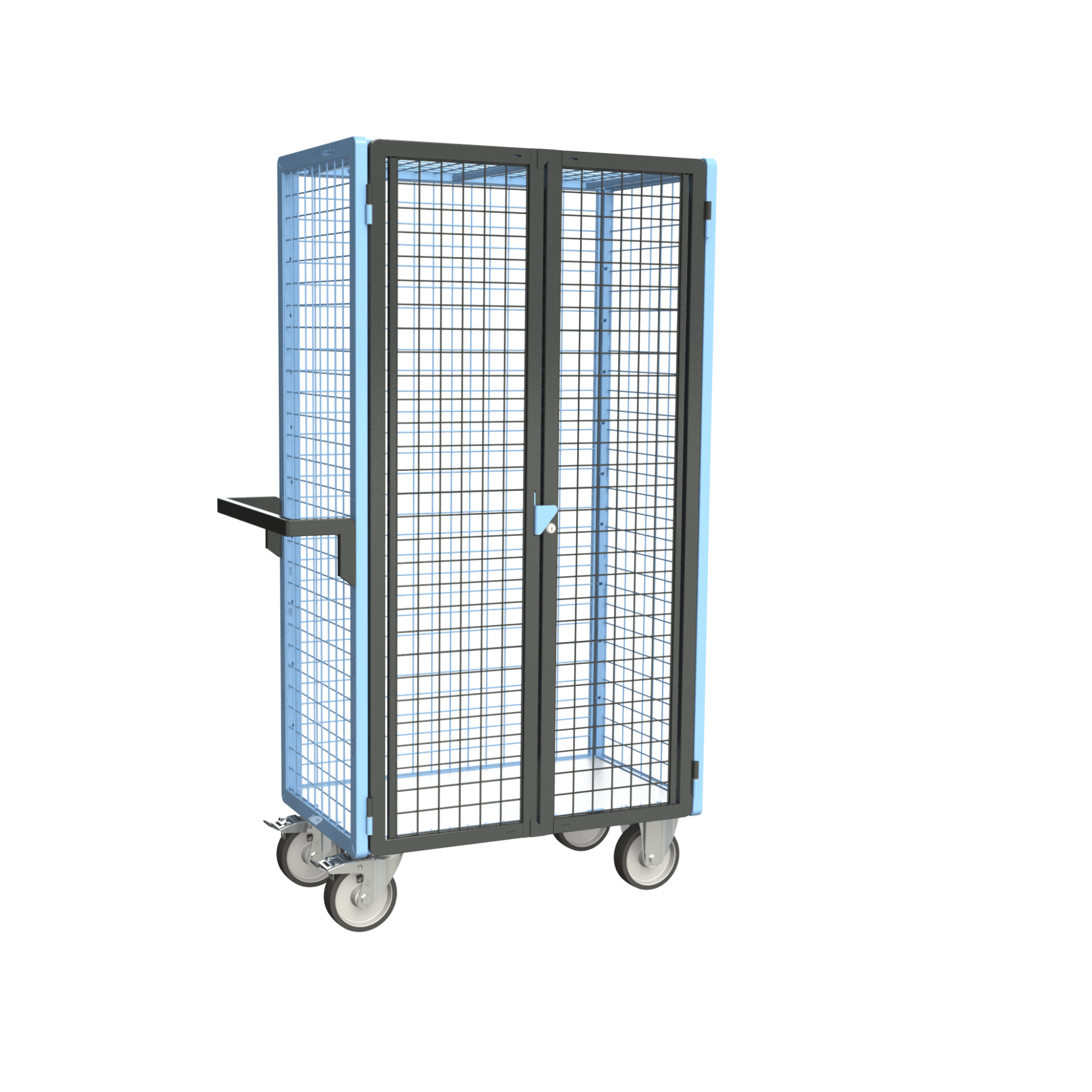 Servante à structure mécano-soudée en tube rectangulaire (35x20 mm), dotée de panneaux grillagés (maille 50x50 mm) pour une modularité des étagères. Verrouillage sécurisé à 3 points avec poignée encastrée, minimisant les risques d'accrochage. Équipée de 4 roues (Ø 160 mm), dont 2 fixes et 2 pivotantes avec frein, pour une manœuvrabilité optimale. Les roues en TPE réduisent de 50 % l'effort nécessaire au démarrage, tout en étant silencieuses et non marquantes. Capacité de charge : 500 kg.