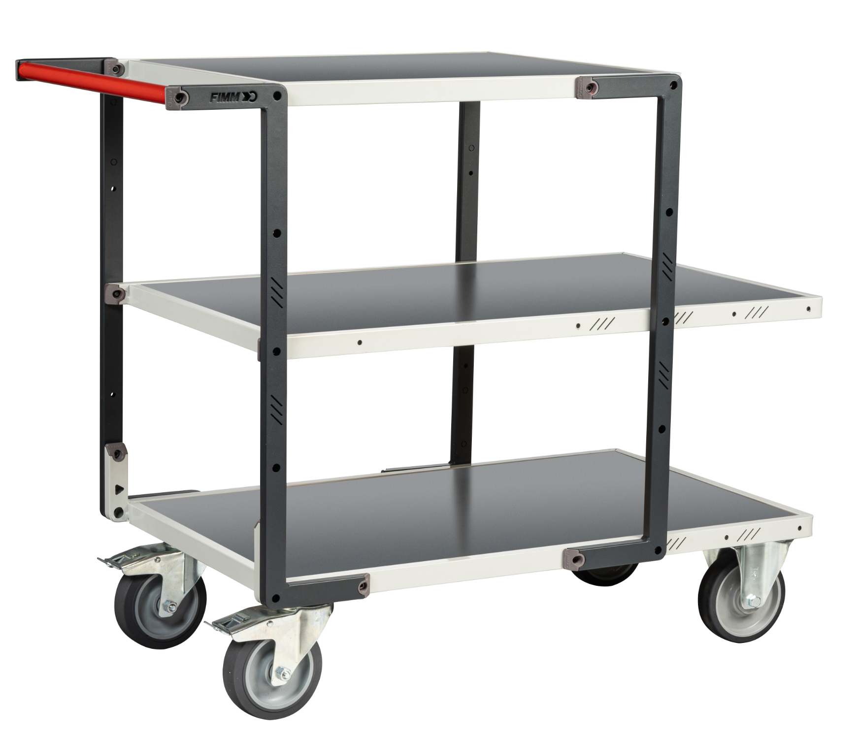 La structure est renforcée par un châssis en tube de 35 × 20 mm avec renfort sous plateau. Les plateaux sont encastrés pour une meilleure solidité. La servante dispose d’une poignée horizontale ergonomique en tube de 28 mm de diamètre, permettant une bonne prise en main ainsi que le positionnement de charges déportées.