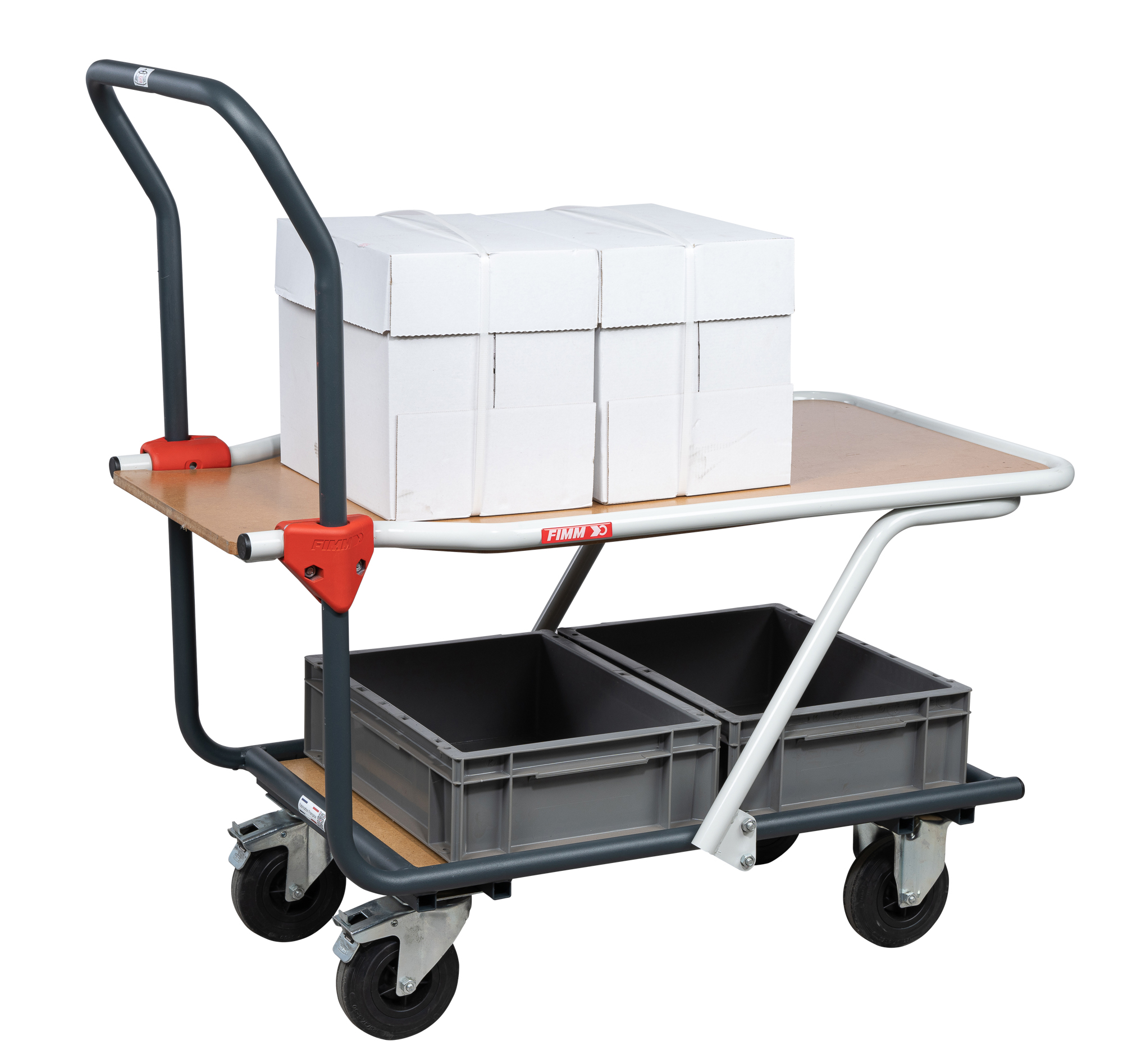 Servante conçue pour déplacer des charges ou des bacs de dimensions 600 × 400 mm sur 2 niveaux. Robuste, cette servante se distingue par son châssis entièrement mécano-soudé et par ses plateaux en bois médium. Châssis conçu pour des utilisations intensives entièrement mécano-soudé. L’absence de montants à l’avant de la servante facilite le chargement des cartons, bacs… Dossier en tube Ø 25 mm. Hauteur ergonomique. Plateau encastré et riveté en bois médium verni d’épaisseur 12 mm. Très résistant, il ne se fend pas, n’éclate pas malgré les chocs répétés. Aucun risque d’écharde. 2 roues fixes + 2 roues pivotantes à frein norme EN 1757.