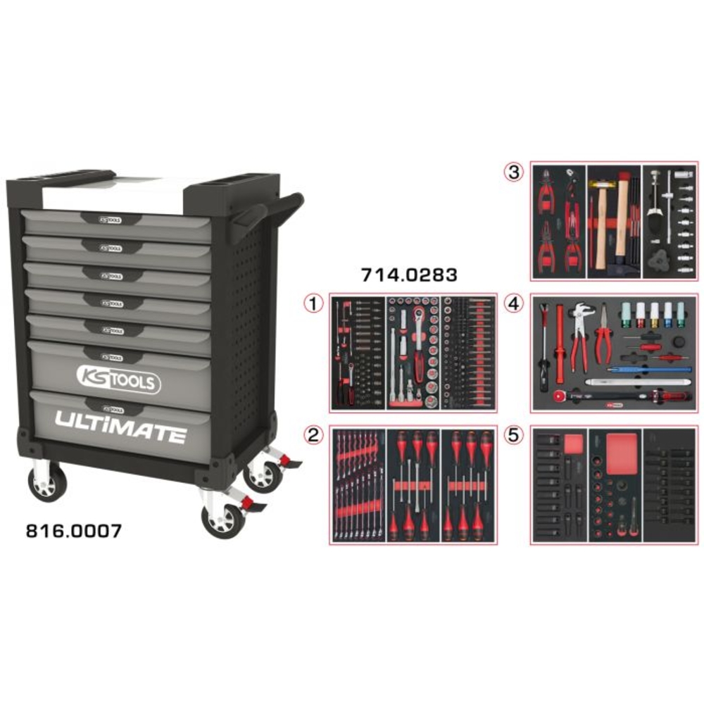 Découvrez Servante ULTIMATE grise et noire 7 tiroirs équipée de 283 outils KS TOOLS - 816.7283 disponible à l'achat