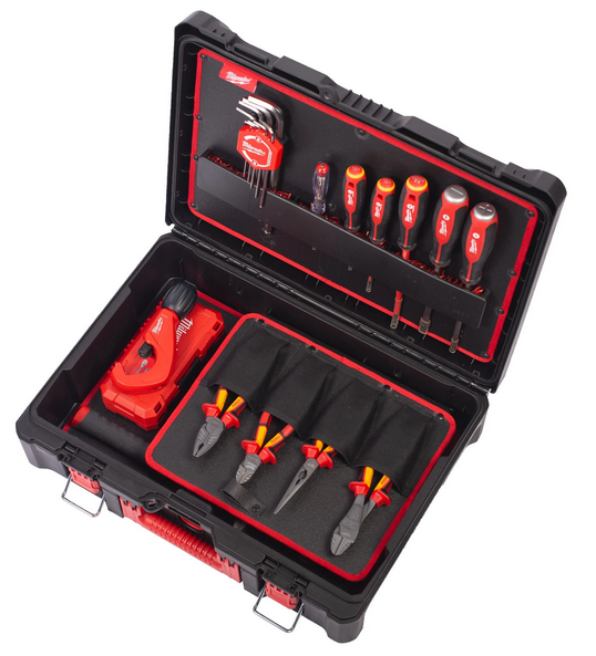 Tous les outils sont rangés dans un coffret MILWAUKEE PACKOUT, modulable, étanche à l’eau et à la poussière, ultra résistant et empilable. Parfait pour un transport sécurisé et un rangement structuré sur tous types de chantiers.