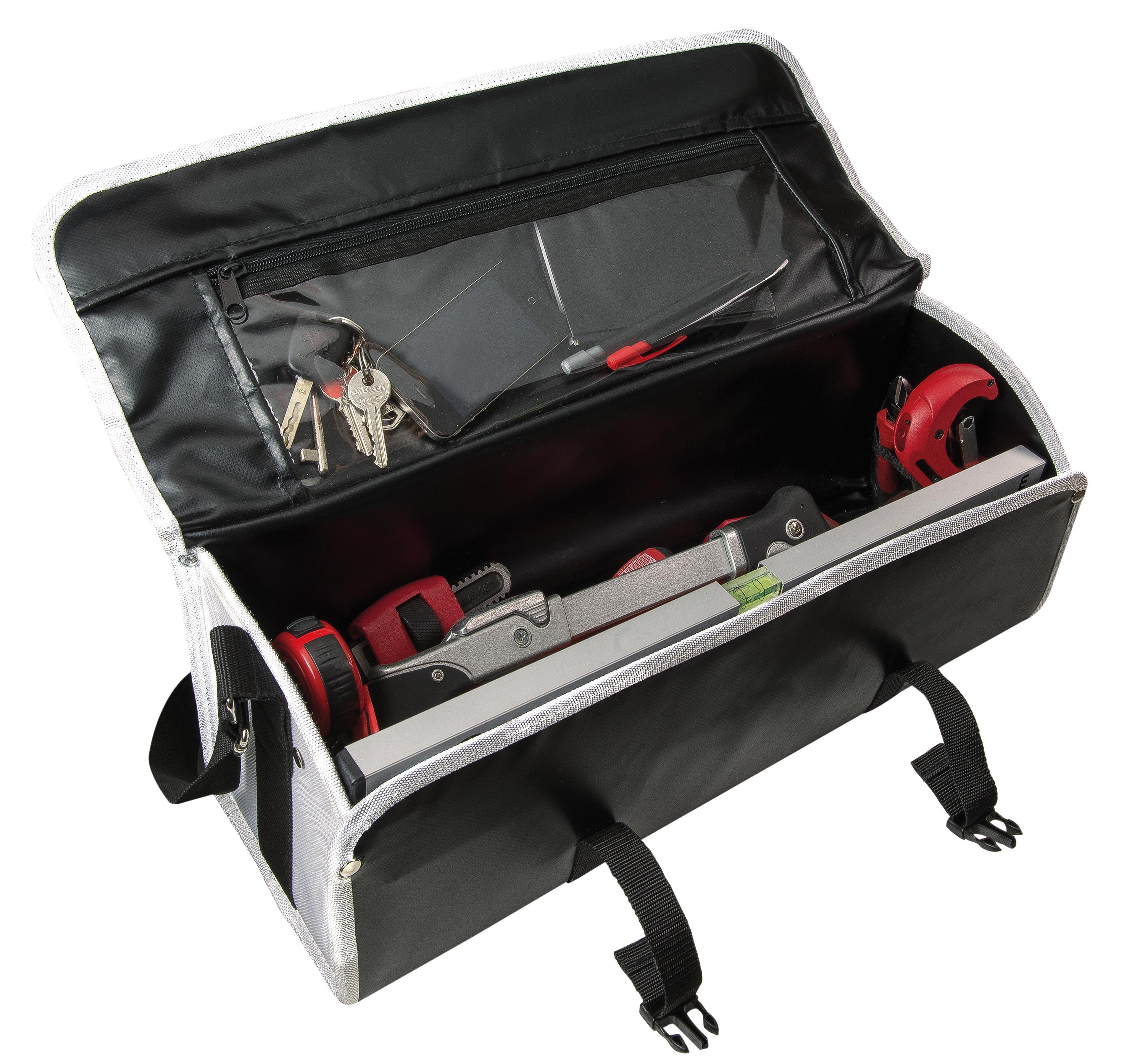 Boite à outils textile en matière PVC, ce qui la rend plus résistante dans les espaces humides ou s'il y a un risque de projections d'eau et dans les espaces poussiéreux ou sales : plus facile à laver. Le format du sac permet de ranger des outils longs ou encombrants comme une scie, une clé stillson, un niveau…(longueur maxi 5 cm). 4 poches intérieures pour le rangement du petit outillage : pinces, clés, tournevis, clés mâles…,1 poche fermée par zip dans le couvercle pour accueillir documents, clés, stylos, téléphones et 1 boucle pour mesure. Fermeture par 2 clips plastiques réglables. Transport par sangle bandoulière réglable. Dimensions 54 x 17 x 225 mm. Volume 1 L. Composition : 5 clés mixtes à cliquet articulées : 8-1-13-17-19 mm // 1 clé à molette Compact' extra-large // 9 clés mâles aimantées // 1 niveau de 5 cm // 1 cutter // 1 mesure de 3 m // 3 tournevis fente : 5.5x1-6.5x15-8x15 // 1 tournevis fente VDE 3.5x75 // 2 tournevis Pozidriv PZ1 - PZ2 // 1 pince coupante 16 mm