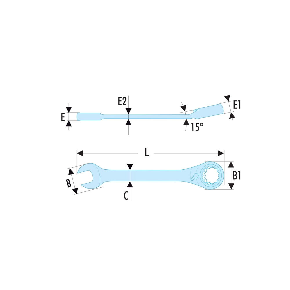 La clé mixte à cliquet FACOM présente des dimensions adaptées pour un grand confort d'utilisation. Avec un incrément de 5° (6° pour les cotes 7, 8 et 9 mm), elle assure un ajustement précis et rapide. Sa tête annulaire inclinée à 15° et sa tête ouverte coudée à 15° facilitent la manipulation dans les espaces confinés. Fabriquée en taille métrique de 15 mm, elle est dotée d'une finition chrome satiné, garantissant durabilité et résistance à l'usure. La solution de fixation SLS intégrée prévient tout risque de chute accidentelle et préserve l'ergonomie de l'utilisateur.
