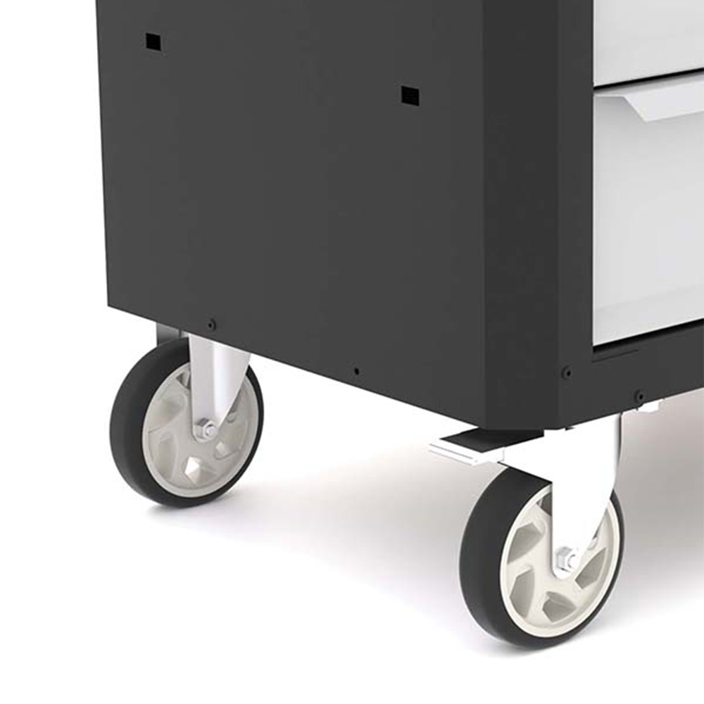 Le déplacement de la servante dans l’atelier est facilité par ces 4 roues qualitatives de diamètre 125 mm (2 pivotantes dont 1 avec frein et 2 fixes) et la large poignée de manutention latérale, pratique et ergonomique.