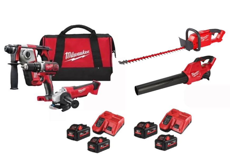 - Comprend perceuse, perforateur, meuleuse, taille haie et souffleur